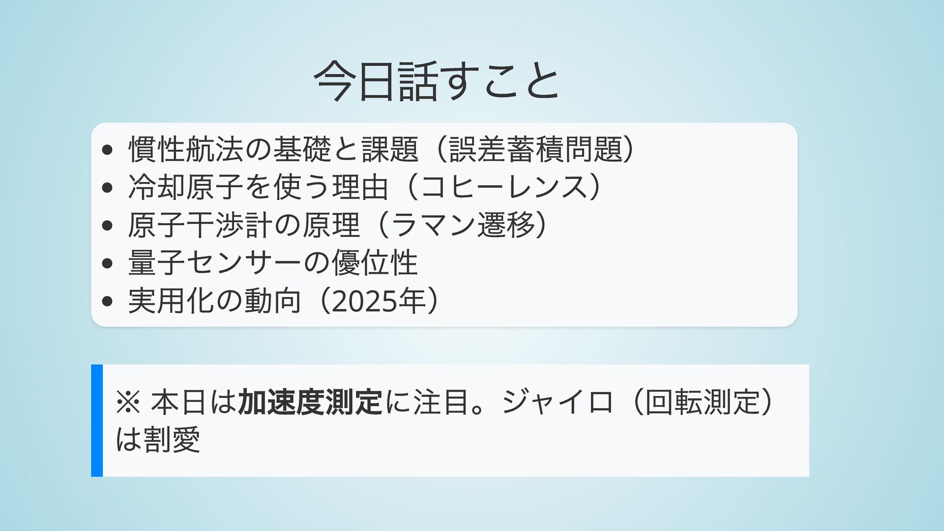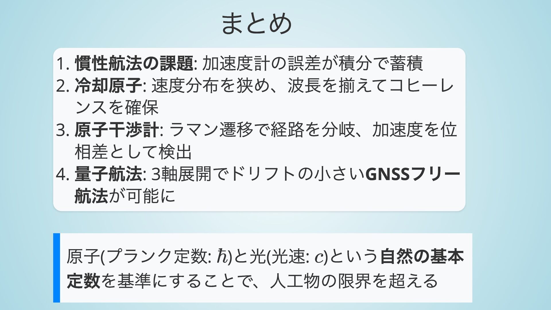 9. まとめ 1. 慣性航法の課題: 加速度計の誤差が積分で蓄積 2. 冷却原子: 速度分布を狭め、波長を揃えてコヒーレ ンスを確保 3. 原子干渉計:
