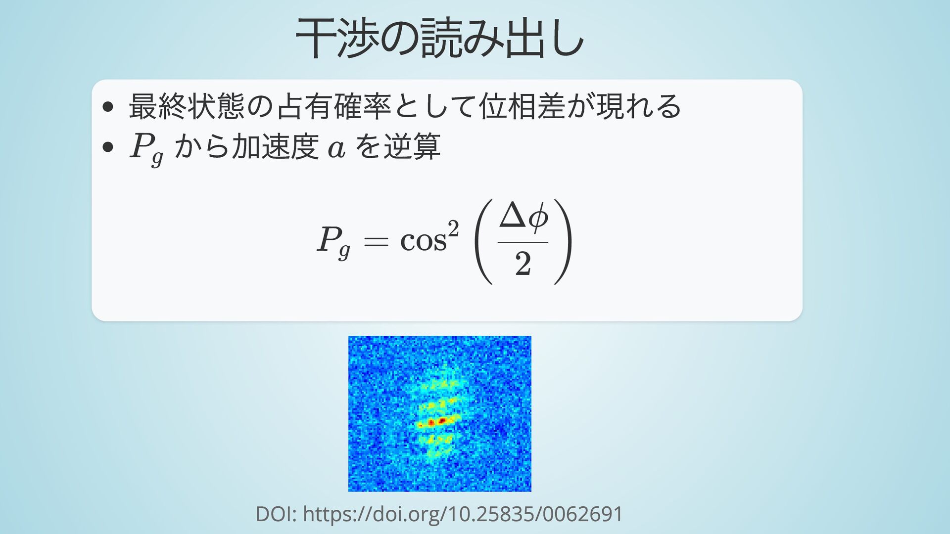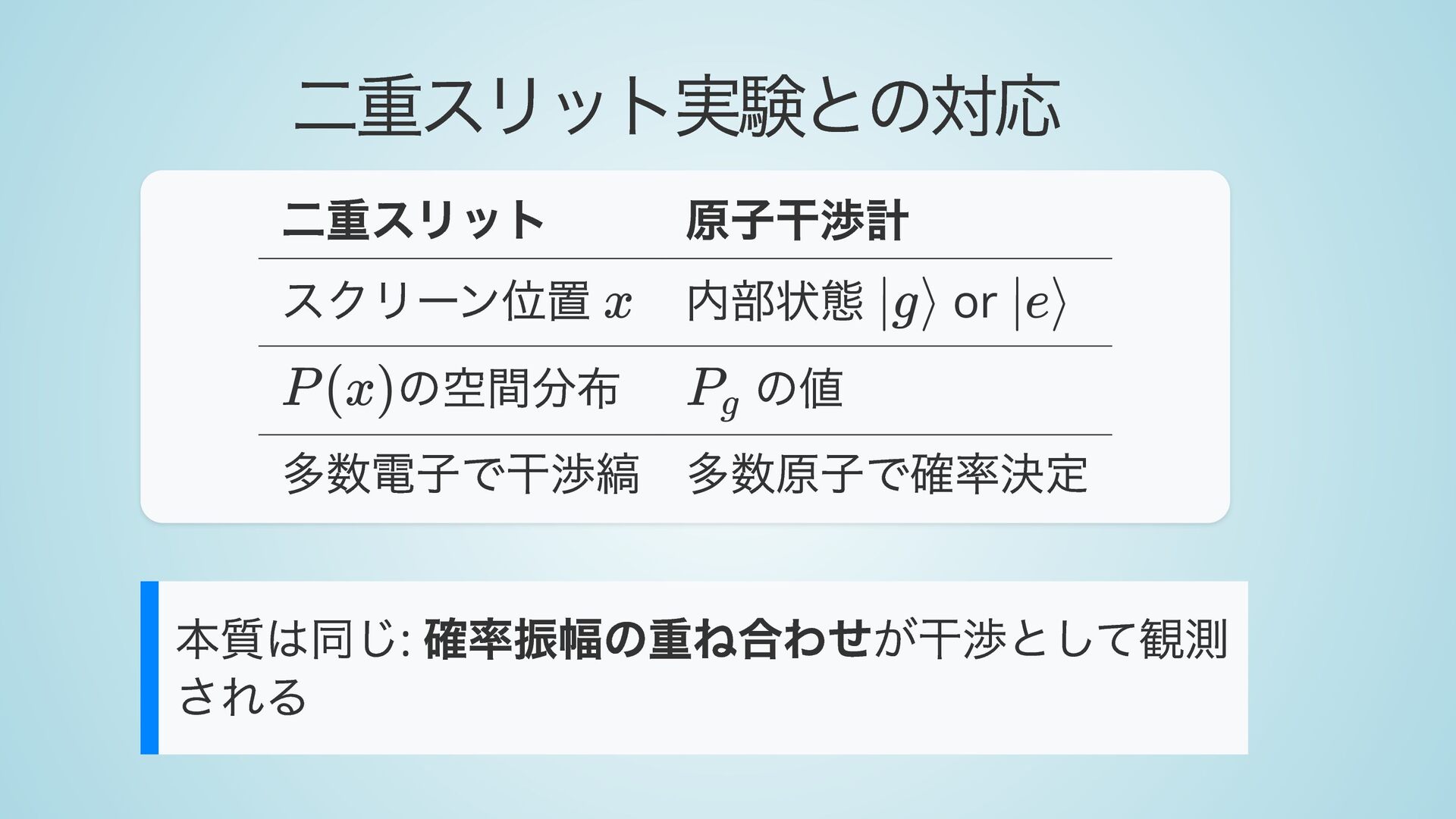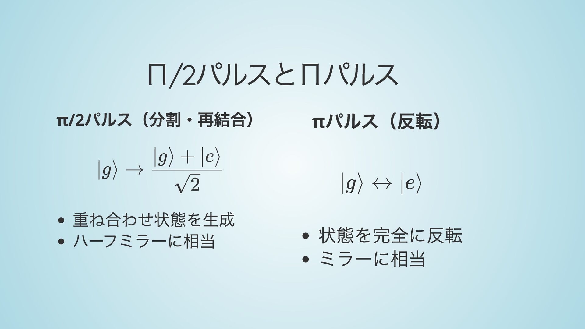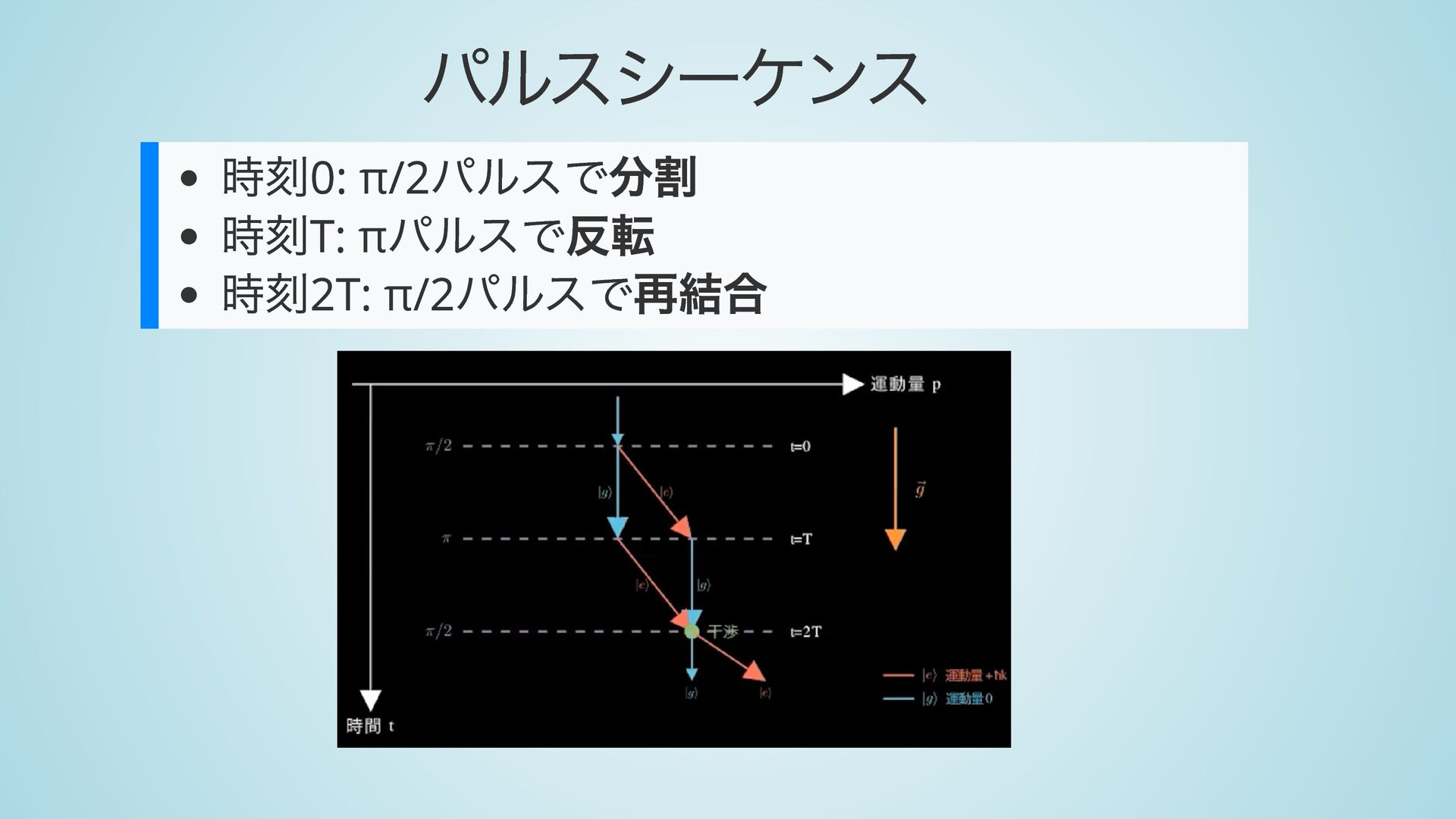 運動量そのまま 状態 → 運動量 状態と運動量が相関 → 経路が分岐 ∣g⟩ ↔ ∣e⟩ ℏk ​ eff ∣g⟩ ∣e⟩ +ℏk ​ eff