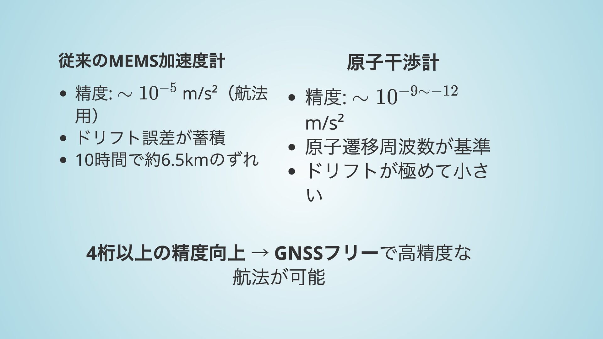 原子干渉計 精度: m/s² 原子遷移周波数が基準 ドリフトが極めて小さ い 4 桁以上の精度向上 → GNSS フリーで高精度な 航法が可能 ∼ 10−5 ∼ 10−9∼−12
