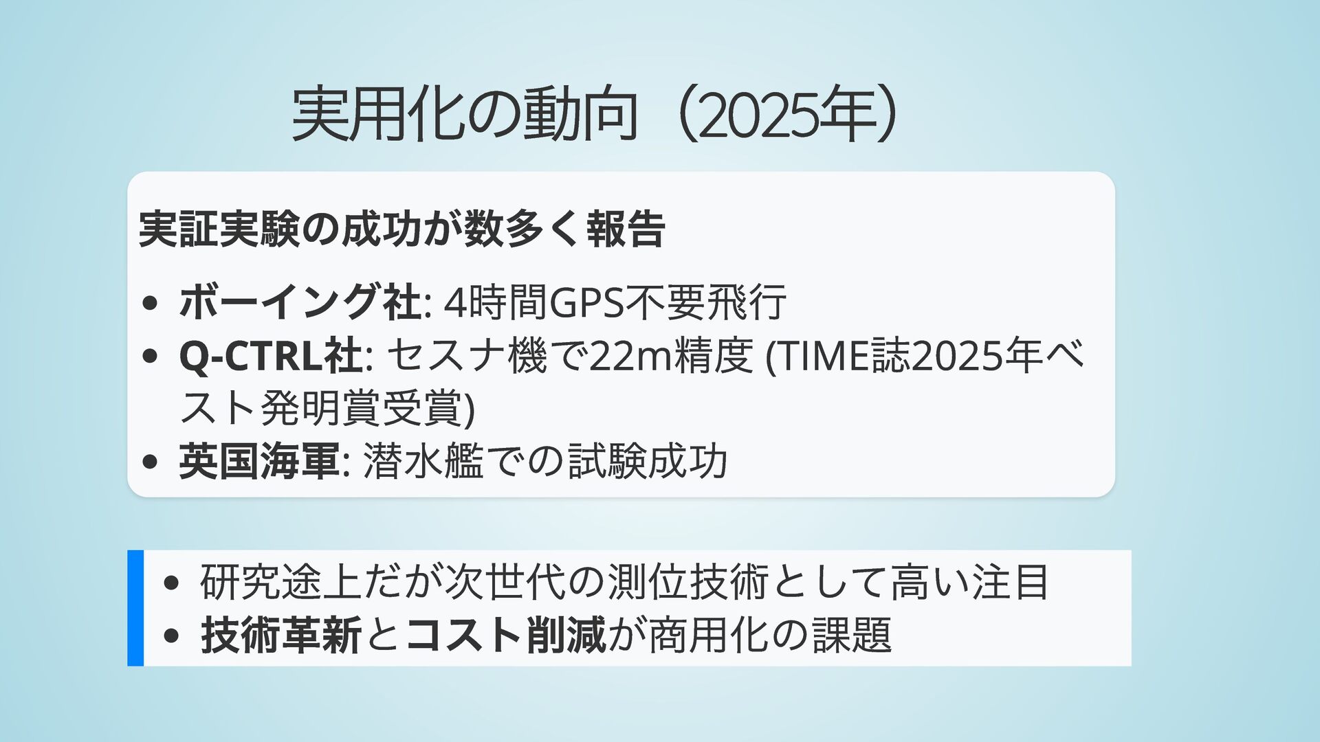 精度 (TIME 誌2025 年ベ スト発明賞受賞) 英国海軍: 潜水艦での試験成功 研究途上だが次世代の測位技術として高い注目 技術革新とコスト削減が商用化の課題