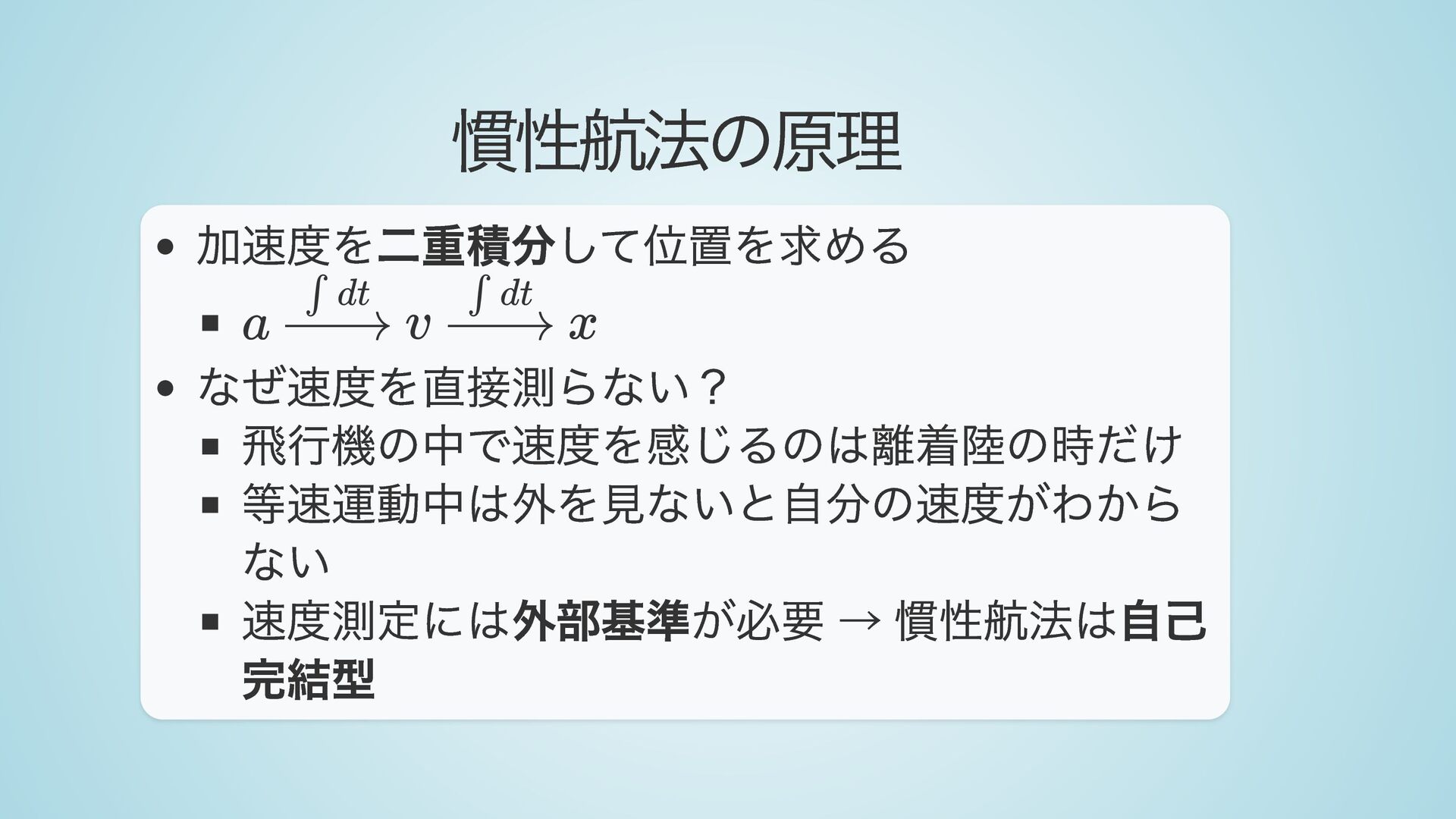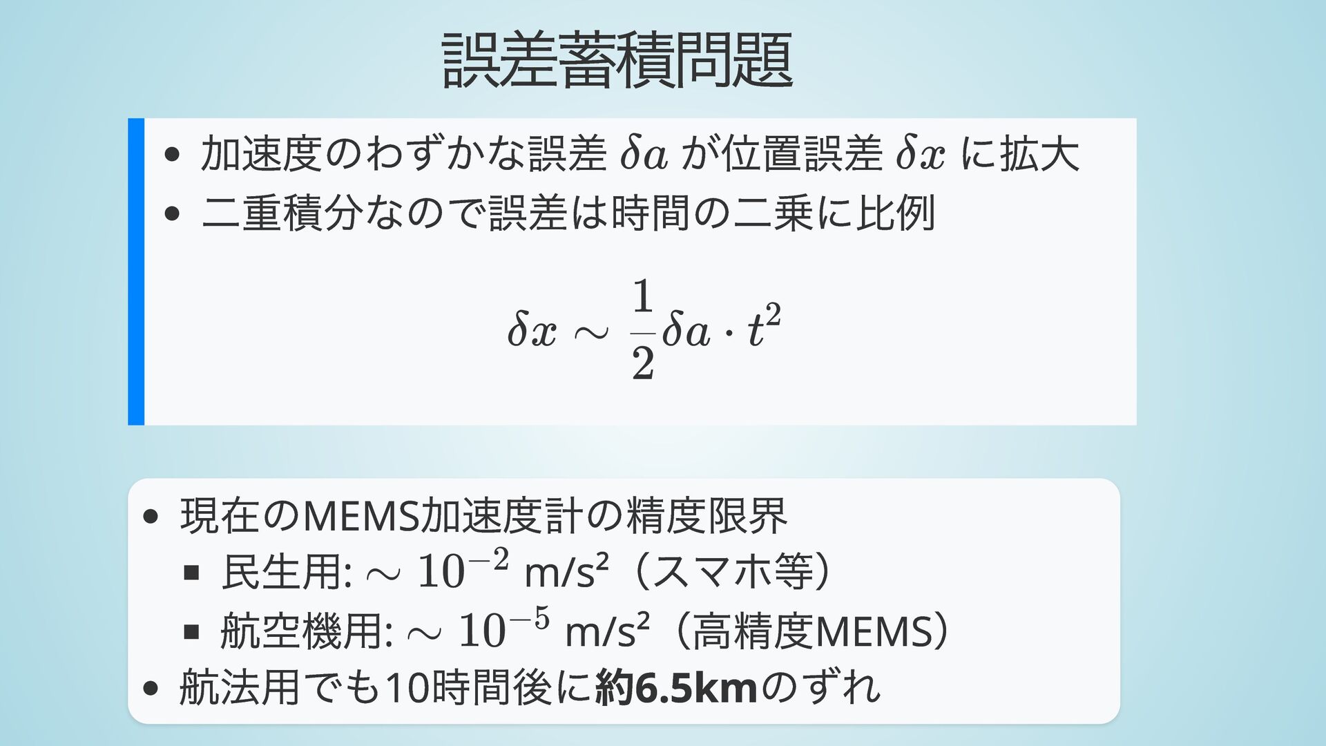 航空機用: m/s² (高精度MEMS ) 航法用でも10 時間後に約6.5km のずれ δa δx δx ∼ ​ δa ⋅ 2 1 t2 ∼ 10−2 ∼ 10−5