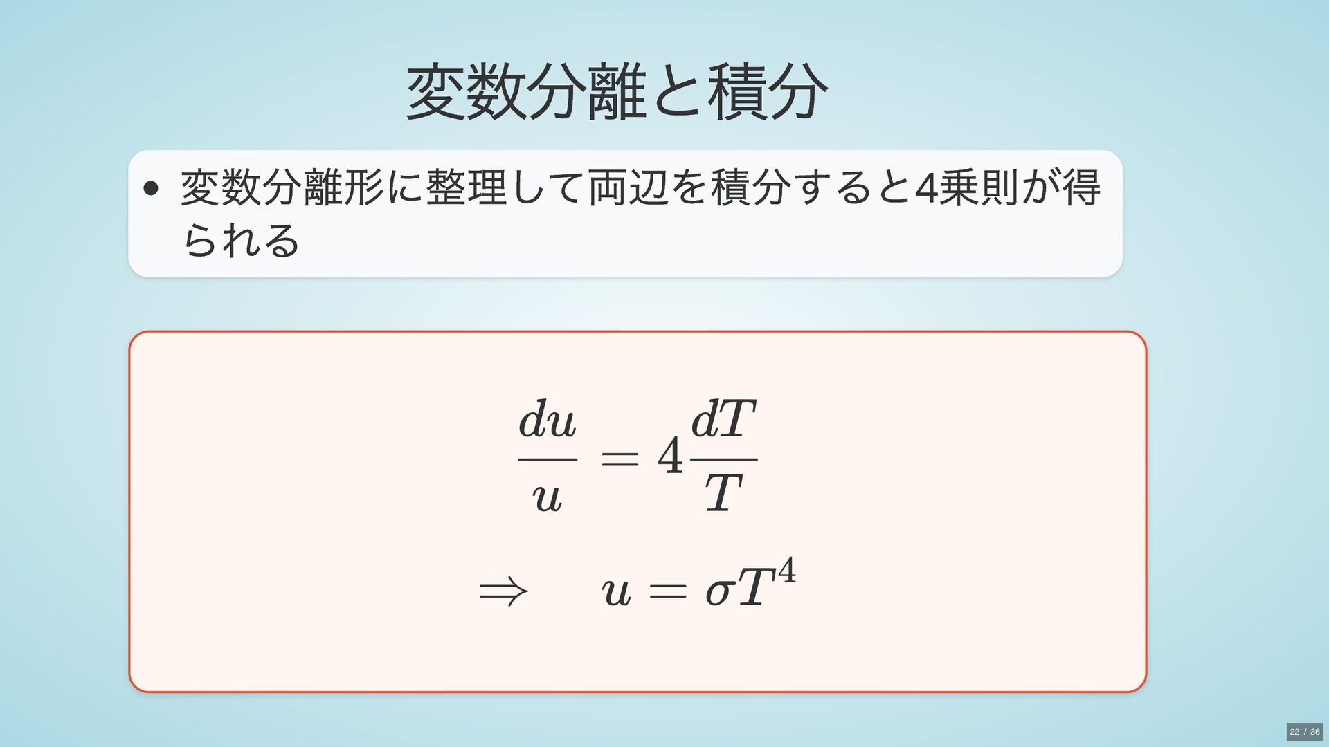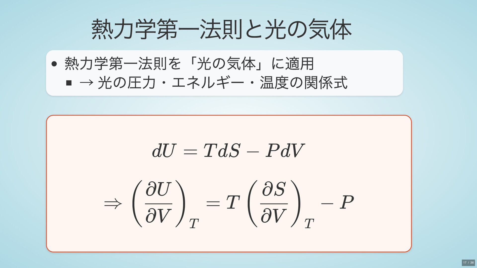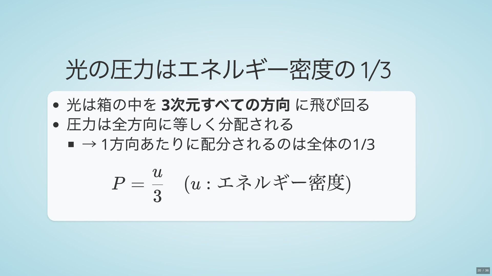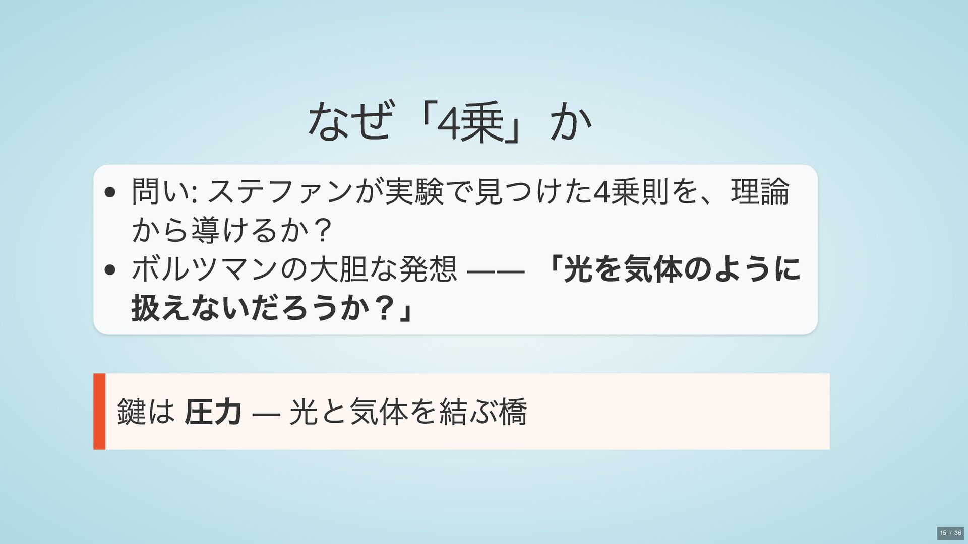 - 「光の気体」という発想から熱力学的に4乗則を導出する流れ