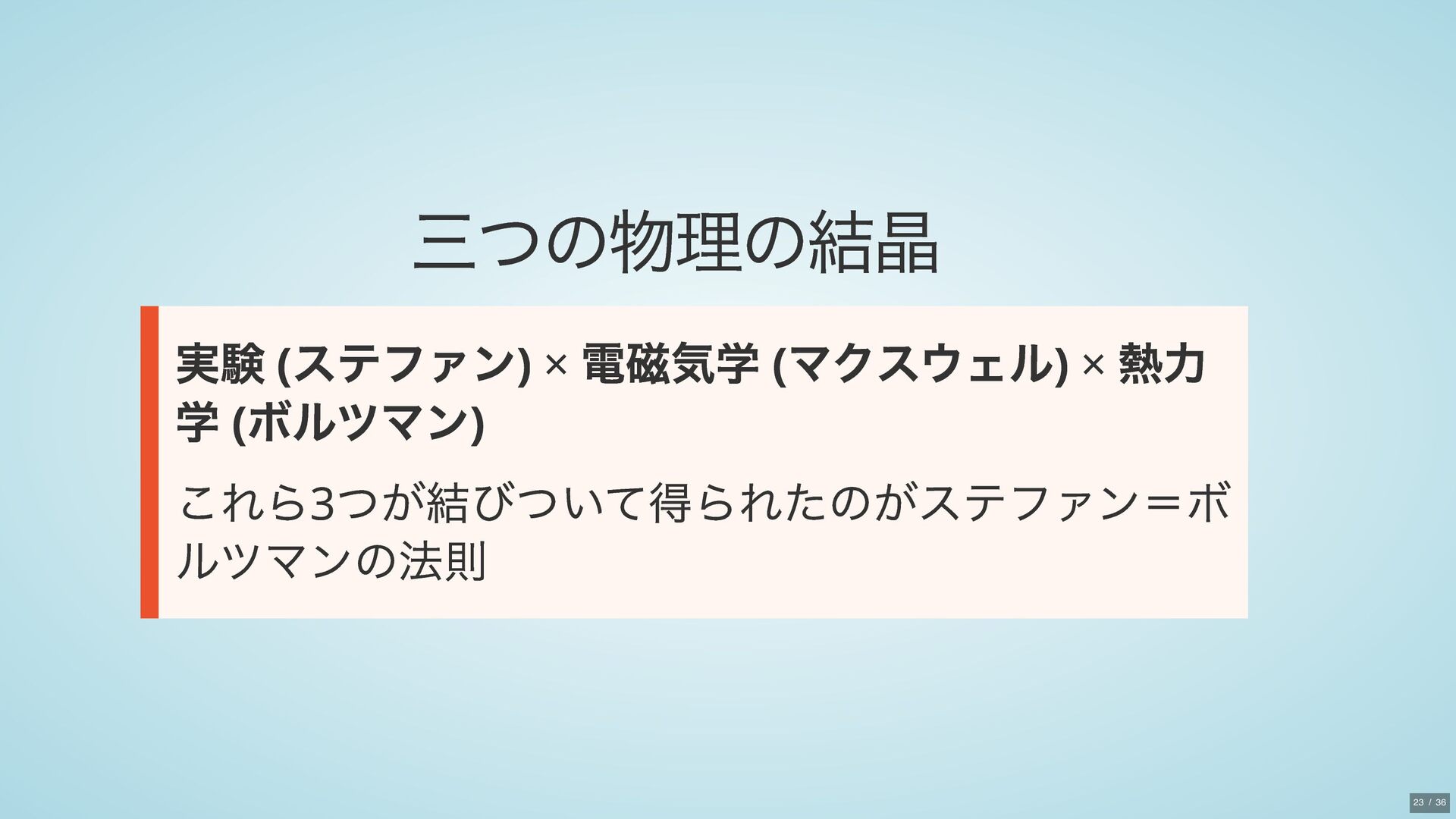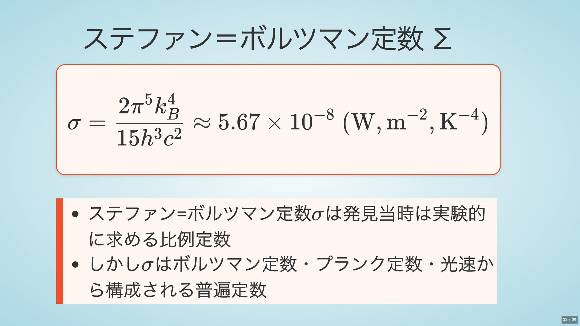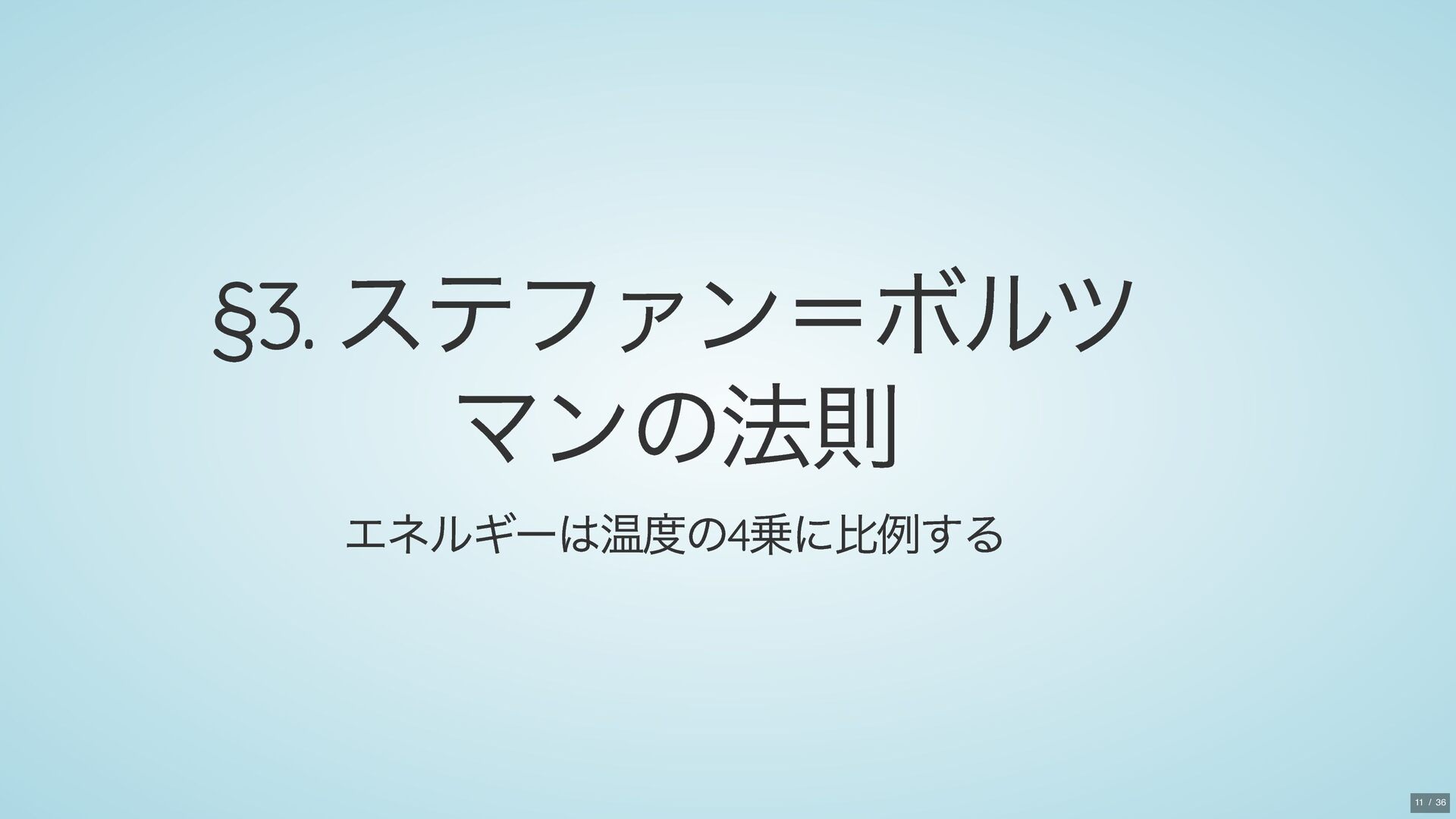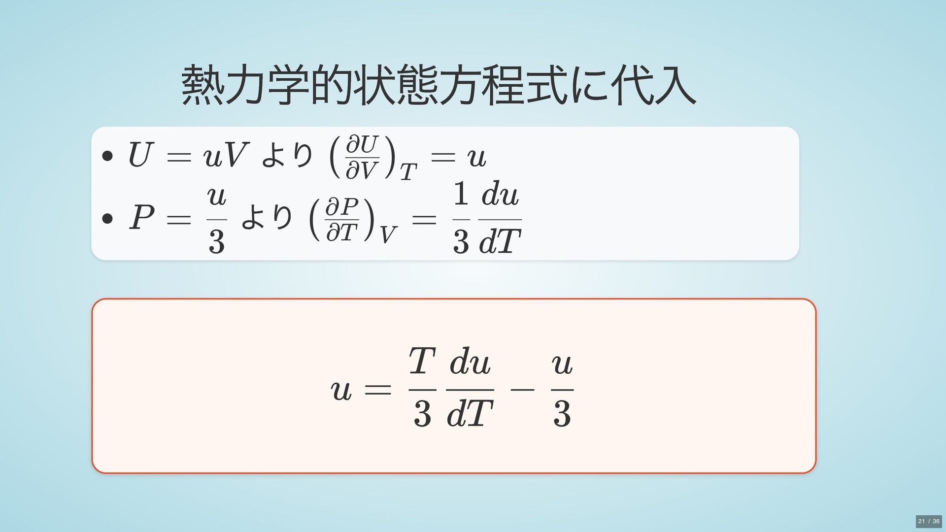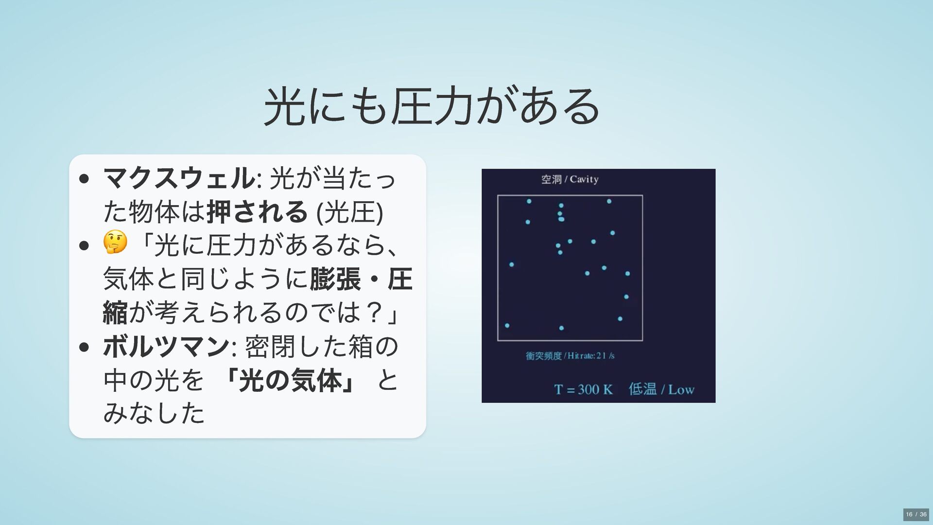 - 「光の気体」という発想から熱力学的に4乗則を導出する流れ
