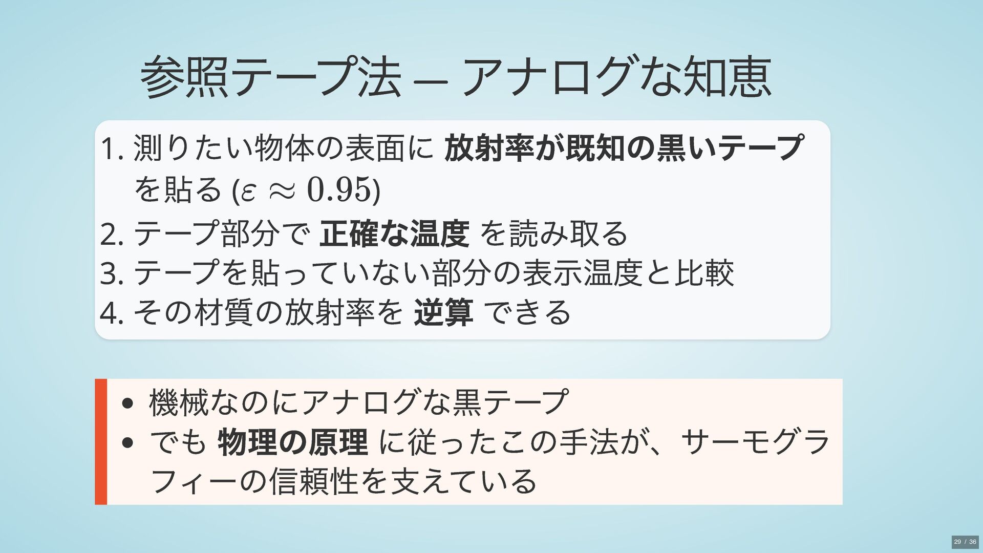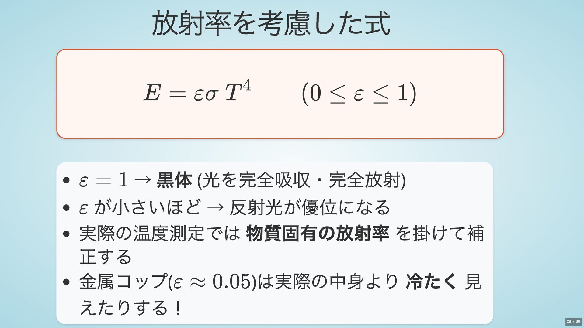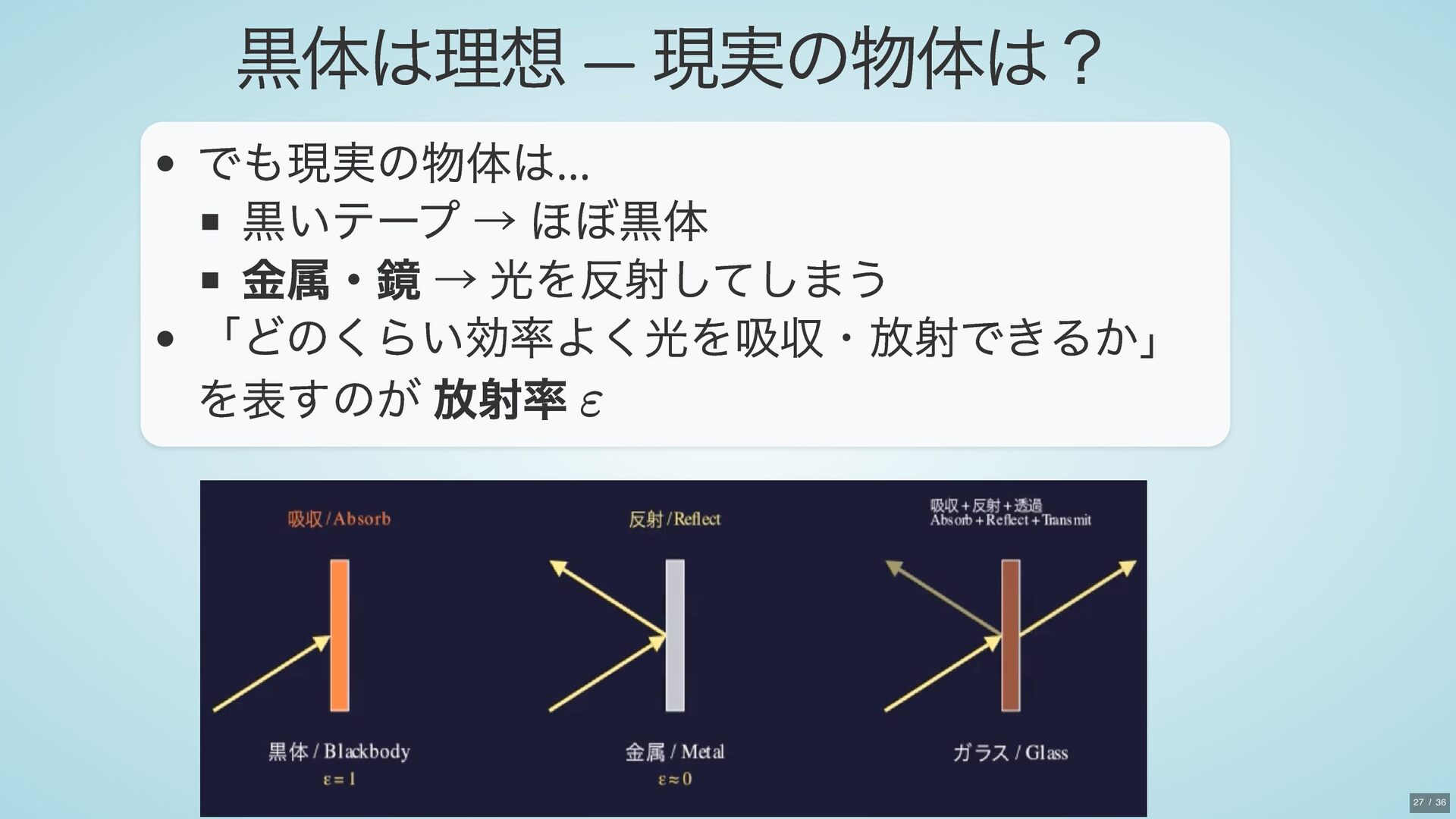 - 黒体という理想と、現実の物体で必要になる放射率 ε による補正