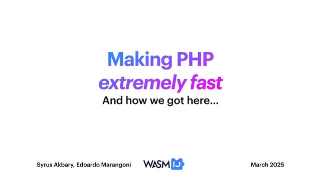 In this talk we'll explore the strategies that we did in Wasmer to make PHP run almost at native speeds, from switching compilers from Cranelift to LLVM, to enable opcache to using WebAssembly Exceptions to bring 10x faster performance.