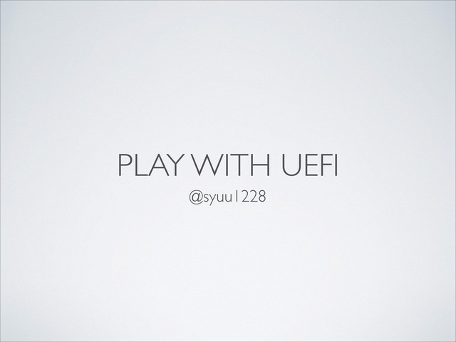 0x39, 0x0, 0xa0, 0xc9, 0x69, 0x72, 0x3b} \ } EFI_GUID gEfiSimpleFileSystemProtocolGuid = EFI_SIMPLE_FILE_SYSTEM_PROTOCOL_GUID; EFI_SIMPLE_FILE_SYSTEM_PROTOCOL *Vol; EFI_FILE_HANDLE Root; EFI_FILE_HANDLE CurDir; EFI_FILE_HANDLE FileHandle; CHAR16 *FileName = L”hoge.txt”; ! gBS->HandleProtocol ( DeviceHandle, &gEfiSimpleFileSystemProtocolGuid, &Vol ); ! Vol->OpenVolume (Vol, &Root); ! CurDir->Open ( CurDir, &FileHandle, FileName, EFI_FILE_MODE_READ, 0 ); •ProtocolͷHandleΛܦ༝ͯ͠APIίʔϧ
