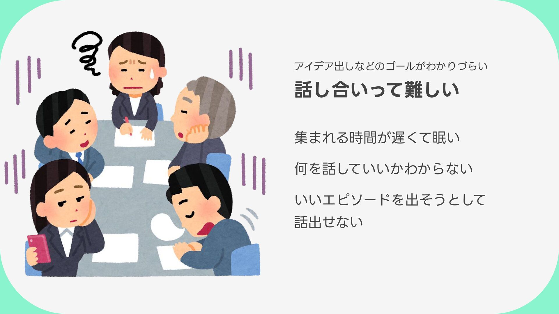 話し合いって難しい 集まれる時間が遅くて眠い 何を話していいかわからない いいエピソードを出そうとして 話出せない アイデア出しなどのゴールがわかりづらい