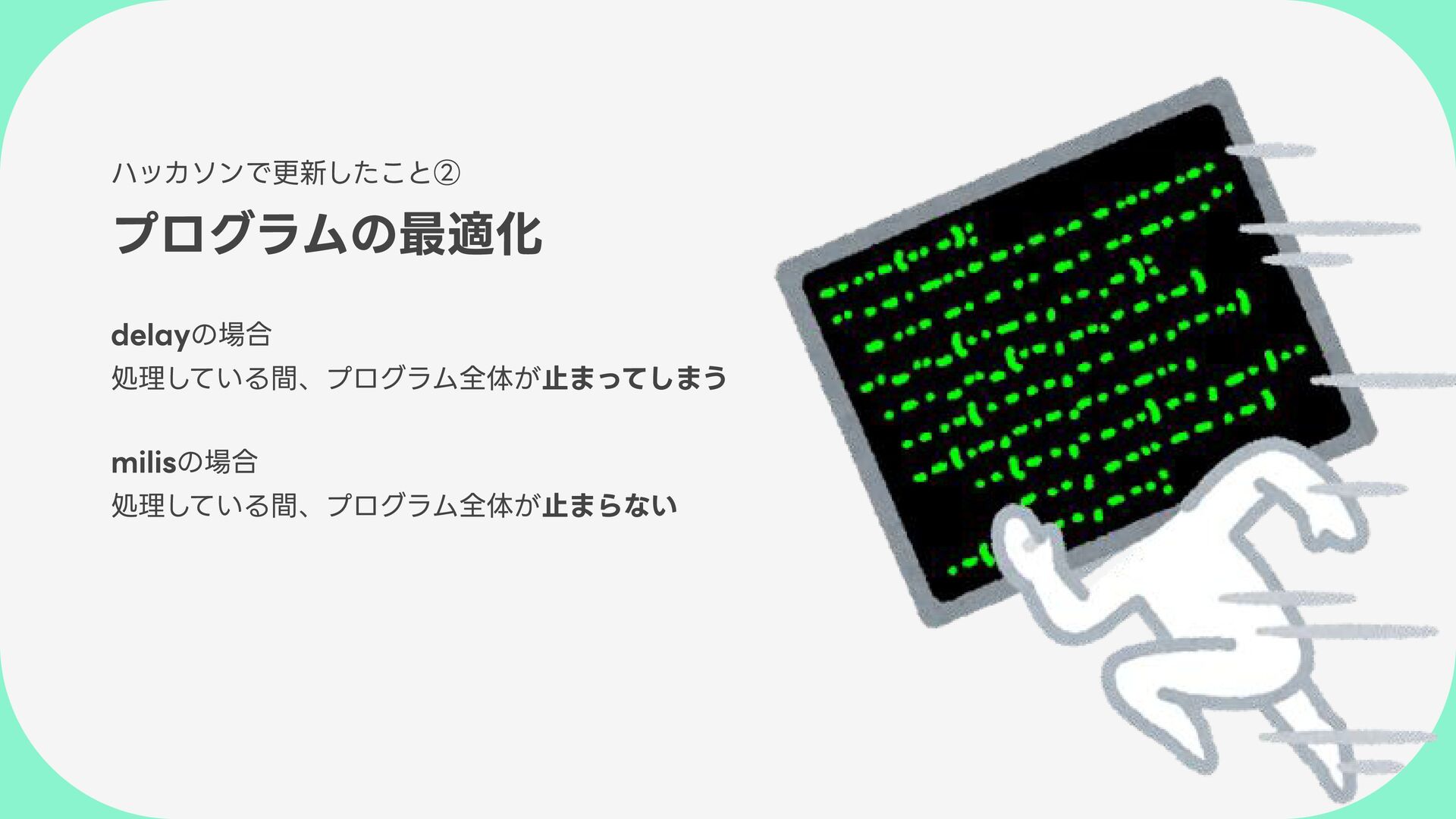 プログラムの最適化 ハッカソンで更新したこと② delayの場合 止まってしまう 処理している間、プログラム全体が milisの場合 止まらない 処理している間、プログラム全体が