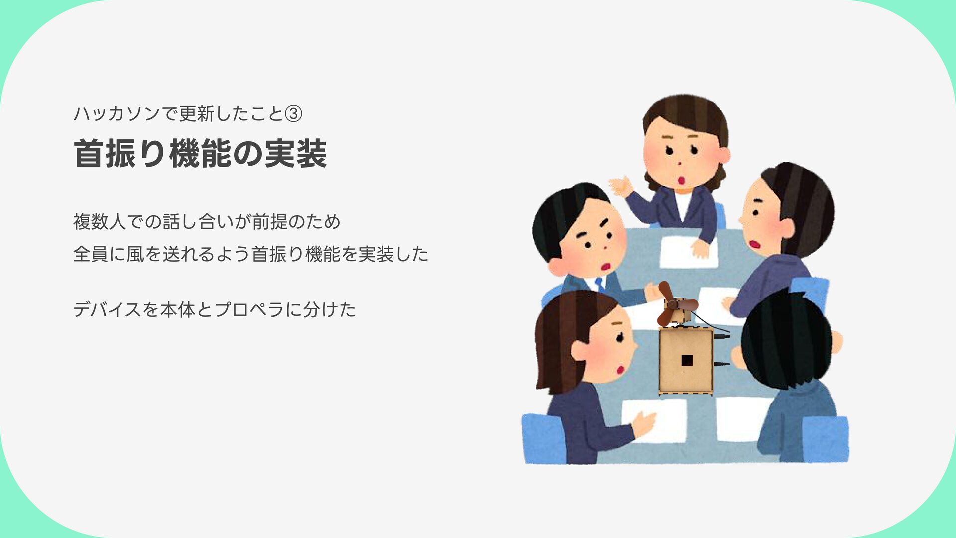 首振り機能の実装 ハッカソンで更新したこと③ デバイスを本体とプロペラに分けた 複数人での話し合いが前提のため 全員に風を送れるよう首振り機能を実装した