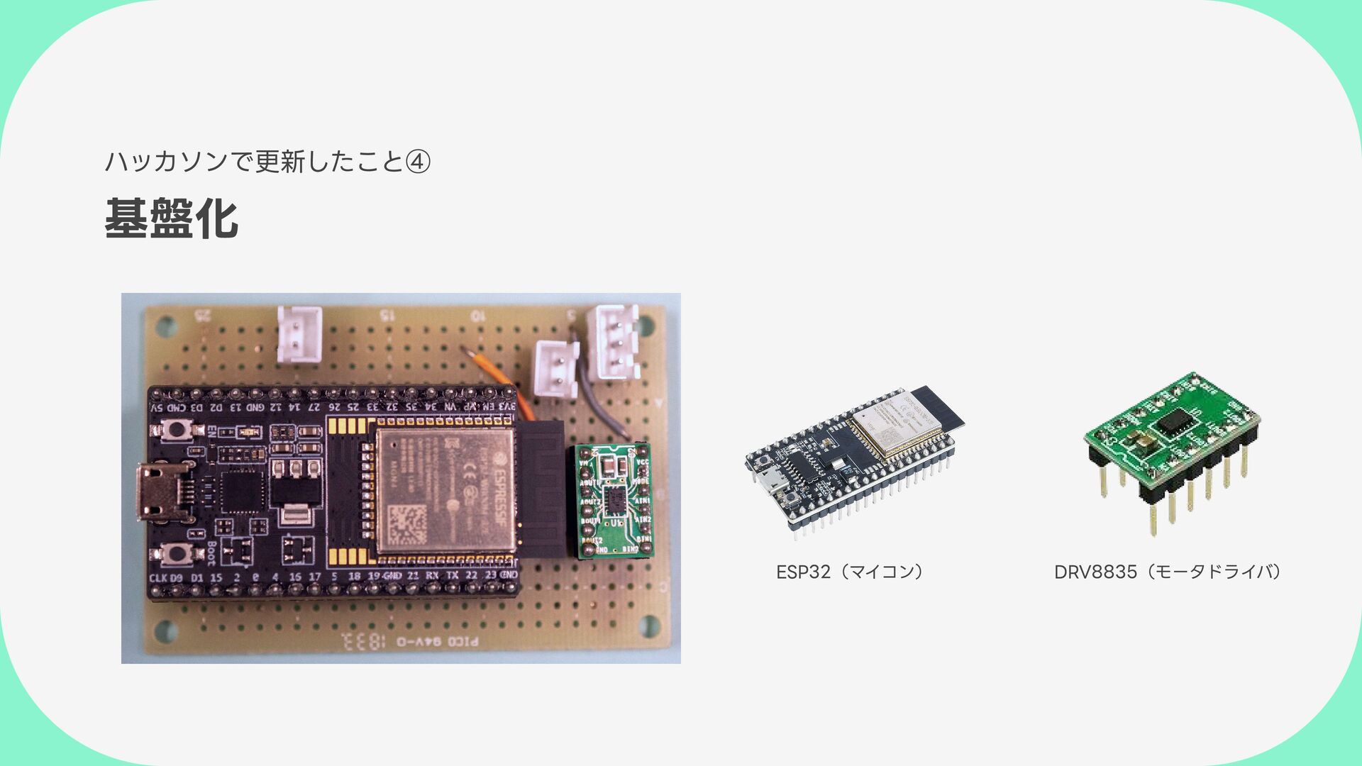 基盤化 ハッカソンで更新したこと④ 基板の写真 ESP32(マイコン) DRV8835(モータドライバ)