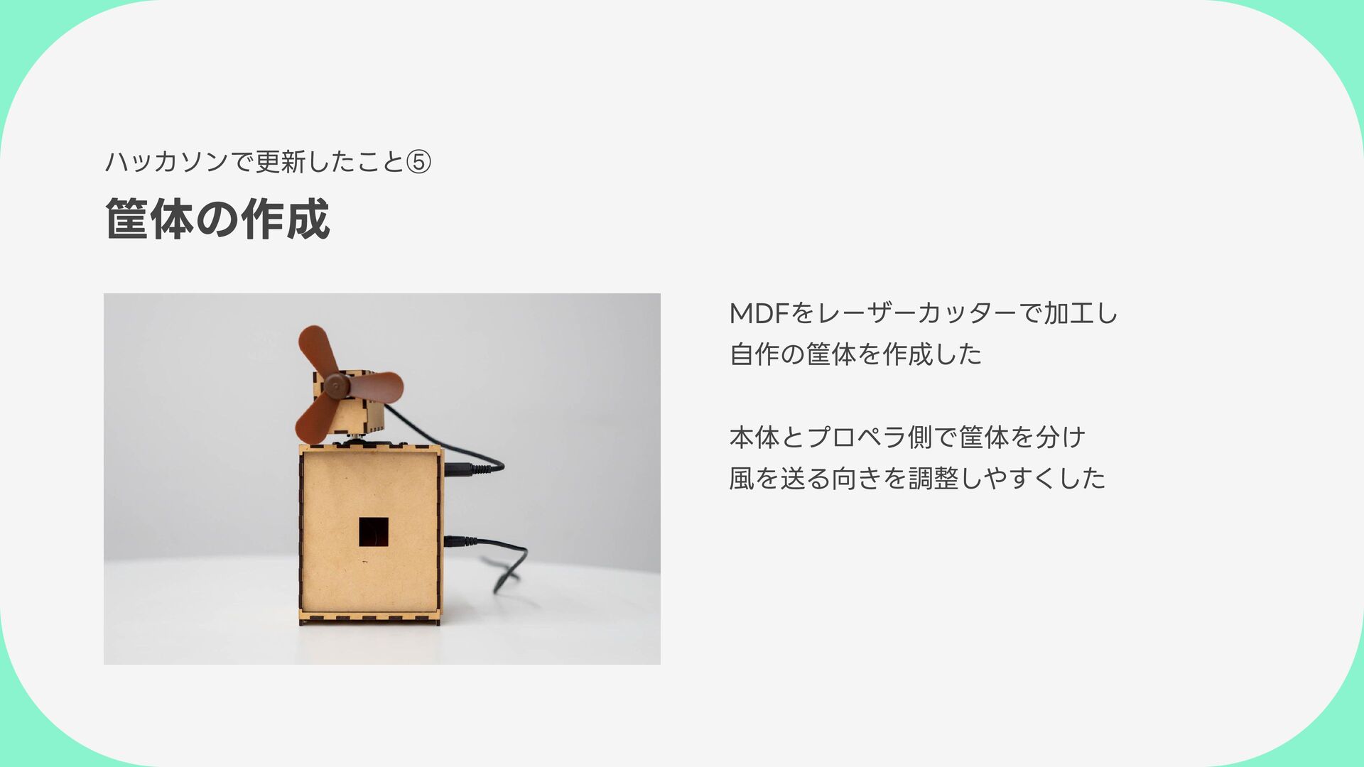筐体の作成 ハッカソンで更新したこと⑤ 本体とプロペラ側で筐体を分け 風を送る向きを調整しやすくした MDFをレーザーカッターで加工し 自作の筐体を作成した