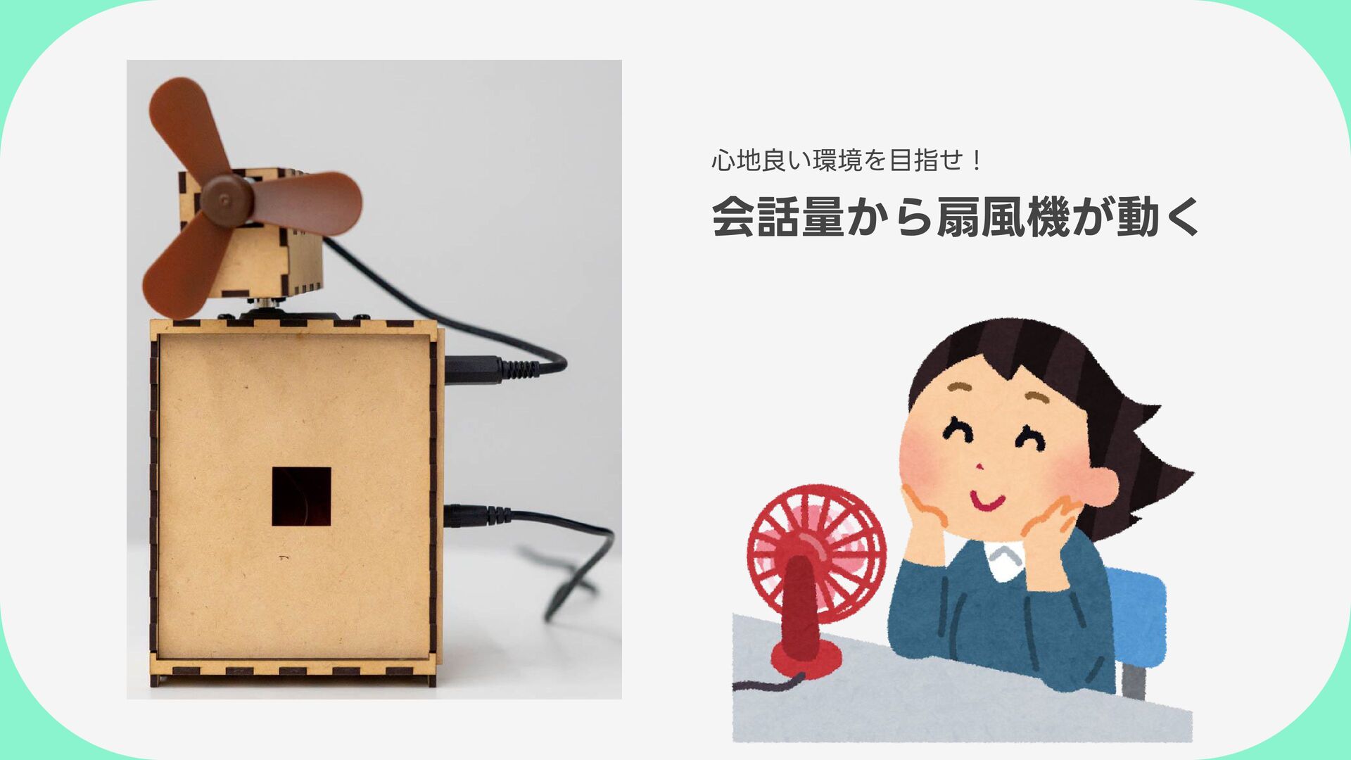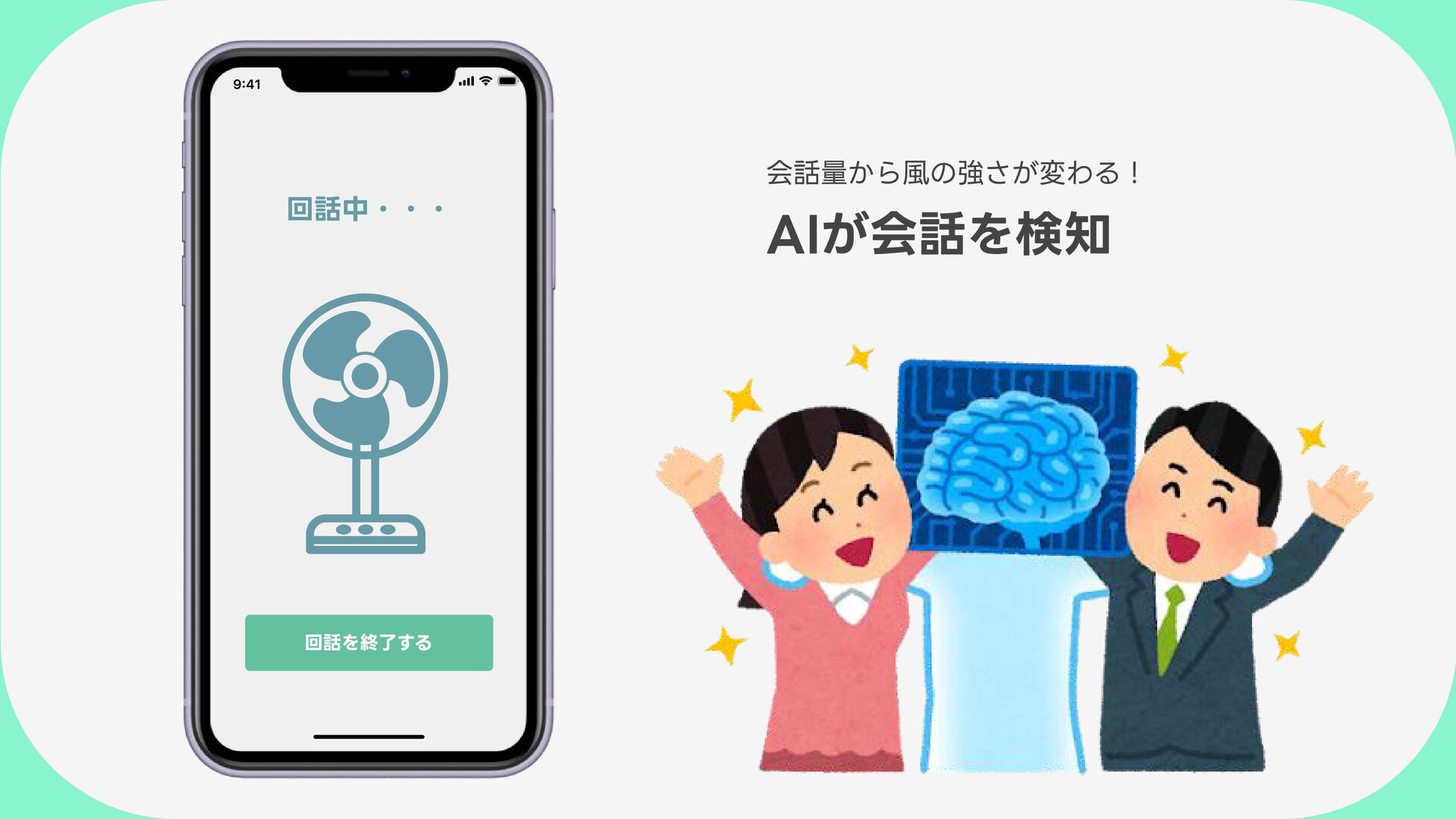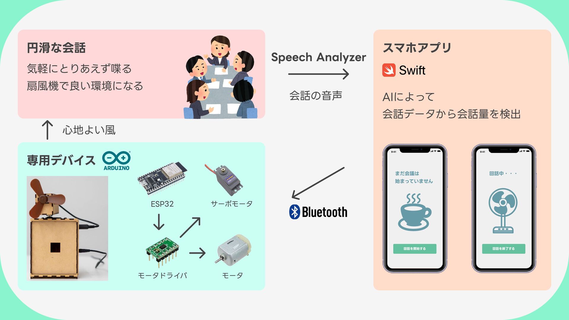 モータ 円滑な会話 会話の音声 心地よい風 気軽にとりあえず喋る 扇風機で良い環境になる スマホアプリ AIによって 会話データから会話量を検出 ESP32