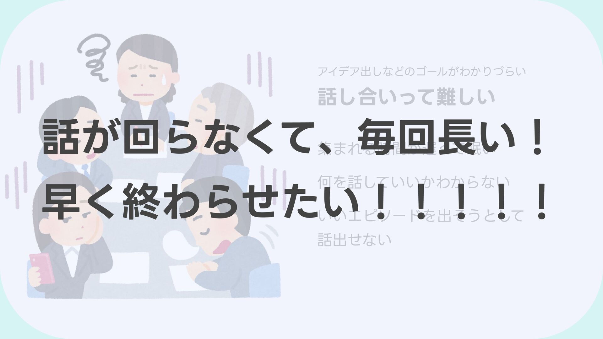 話し合いって難しい 集まれる時間が遅くて眠い 何を話していいかわからない いいエピソードを出そうとして 話出せない アイデア出しなどのゴールがわかりづらい 話が回らなくて、毎回長い! 早く終わらせたい!!!!!