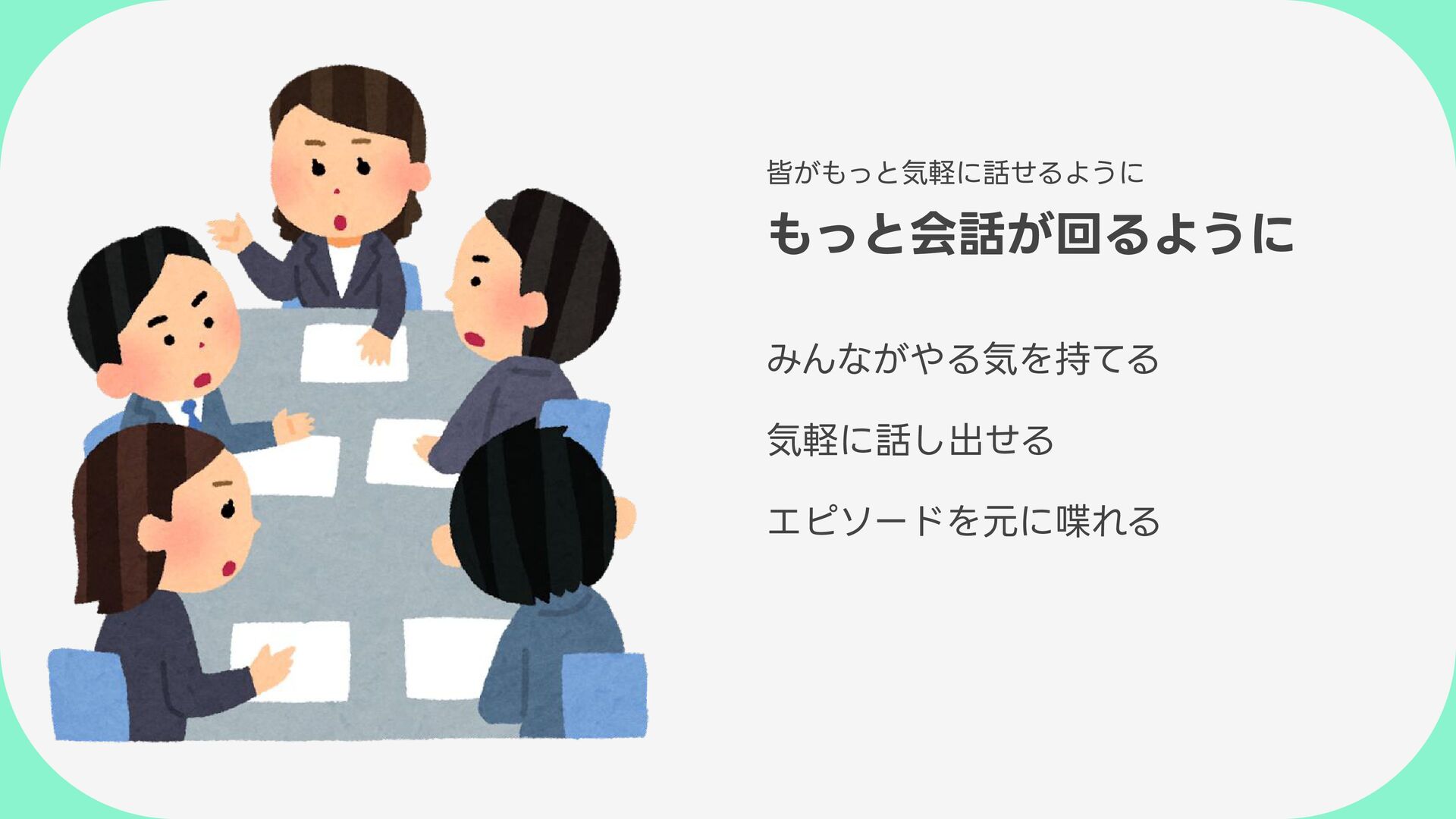 もっと会話が回るように みんながやる気を持てる 気軽に話し出せる エピソードを元に喋れる 皆がもっと気軽に話せるように