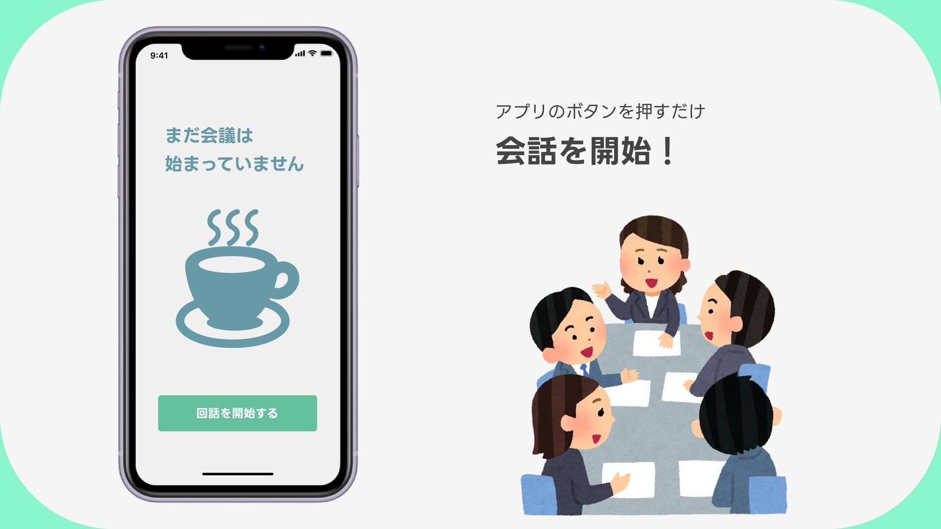 会話を開始! アプリのボタンを押すだけ まだ会議は 始まっていません 回話を開始する 9:41