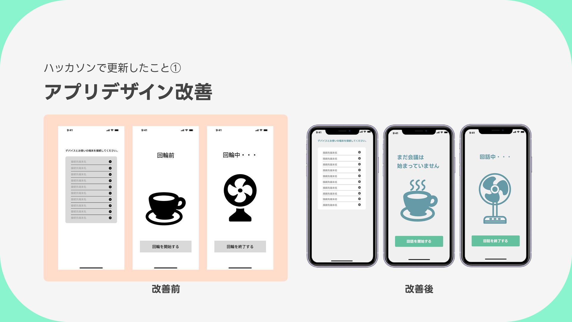アプリデザイン改善 ハッカソンで更新したこと① 回輪前 回輪を開始する 9:41 接続先端末名 接続先端末名 接続先端末名 接続先端末名 接続先端末名
