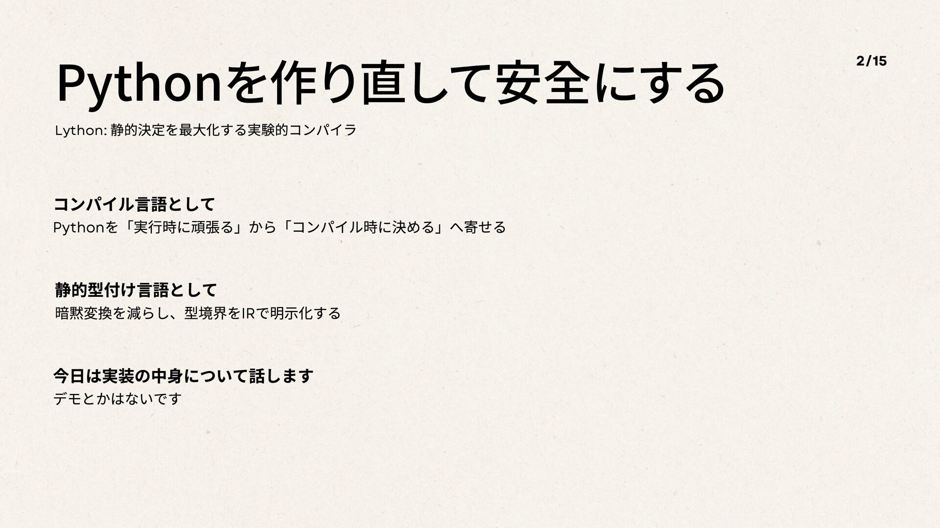 Pythonを作り直して安全にする Lython: 静的決定を最⼤化する実験的コンパイラ コンパイル言語として Python を「実⾏時に頑張る」から「コンパイル時に決める」へ寄せる 静的型付け言語として 暗黙変換を減らし、型境界をIR で明⽰化する 今日は実装の中身について話します