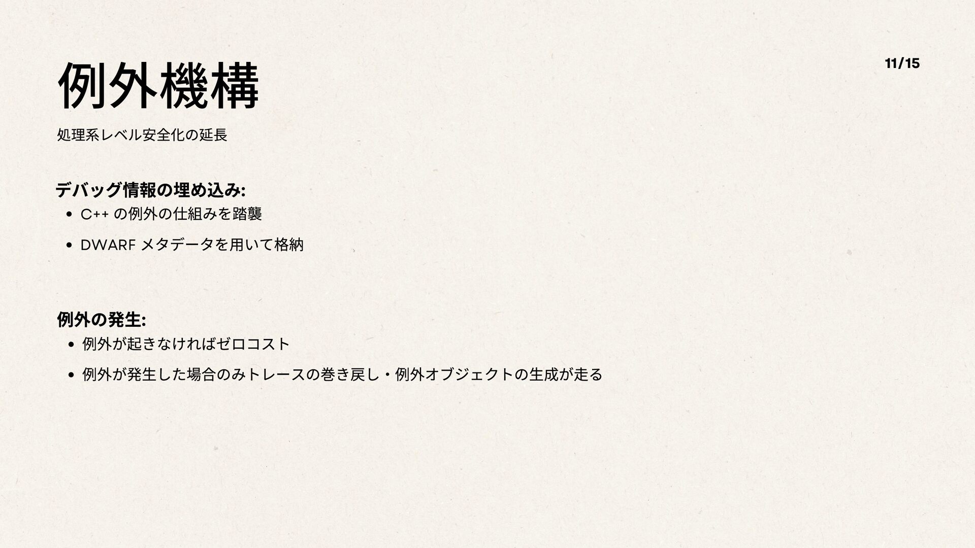 例外機構 処理系レベル安全化の延長 11/15 デバッグ情報の埋め込み: C++ の例外の仕組みを踏襲 DWARF メタデータを⽤いて格納 例外の発生: 例外が起きなければゼロコスト