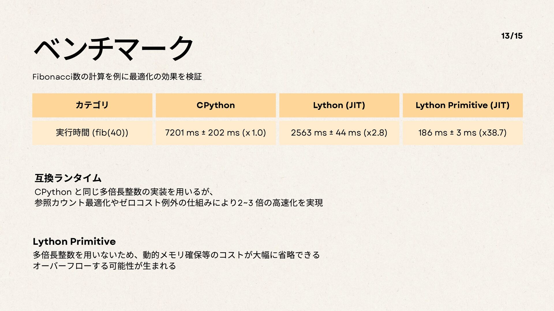 ベンチマーク Fibonacci 数の計算を例に最適化の効果を検証 13/15 カテゴリ CPython Lython (JIT) Lython Primitive