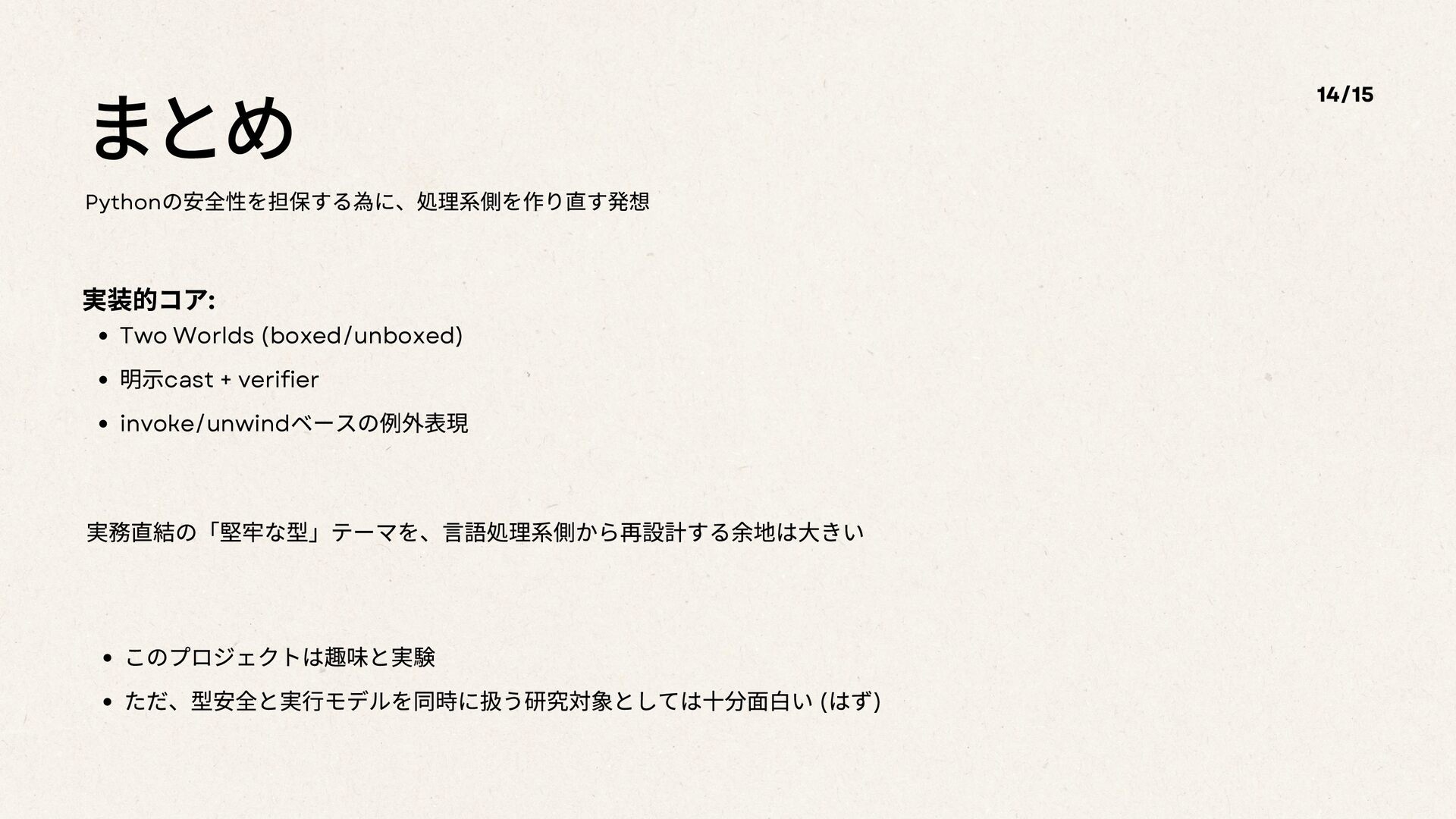 まとめ Python の安全性を担保する為に、処理系側を作り直す発想 14/15 実装的コア: Two Worlds (boxed/unboxed) 明示cast +