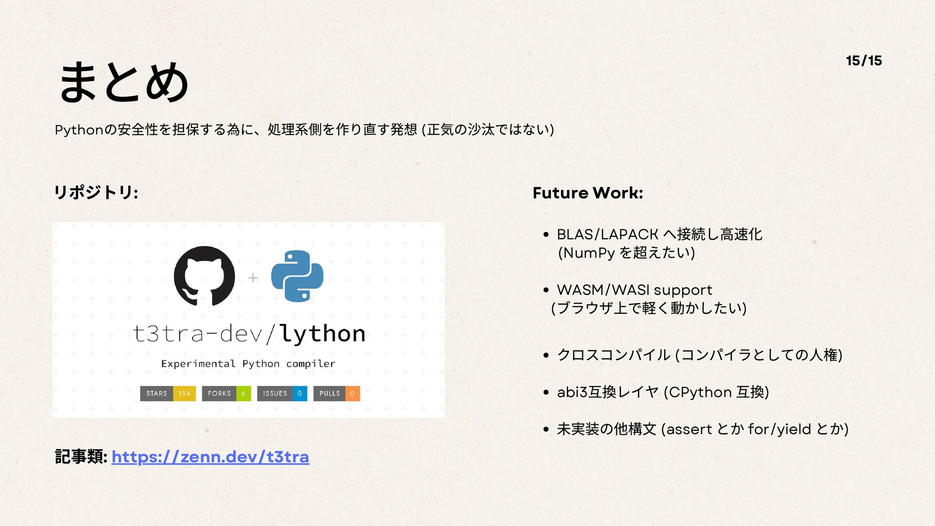 へ接続し高速化 (NumPy を超えたい) WASM/WASI support ( ブラウザ上で軽く動かしたい) クロスコンパイル ( コンパイラとしての人権) abi3 互換レイヤ (CPython 互換) 未実装の他構文 (assert とか for/yield とか) 記事類: https://zenn.dev/t3tra