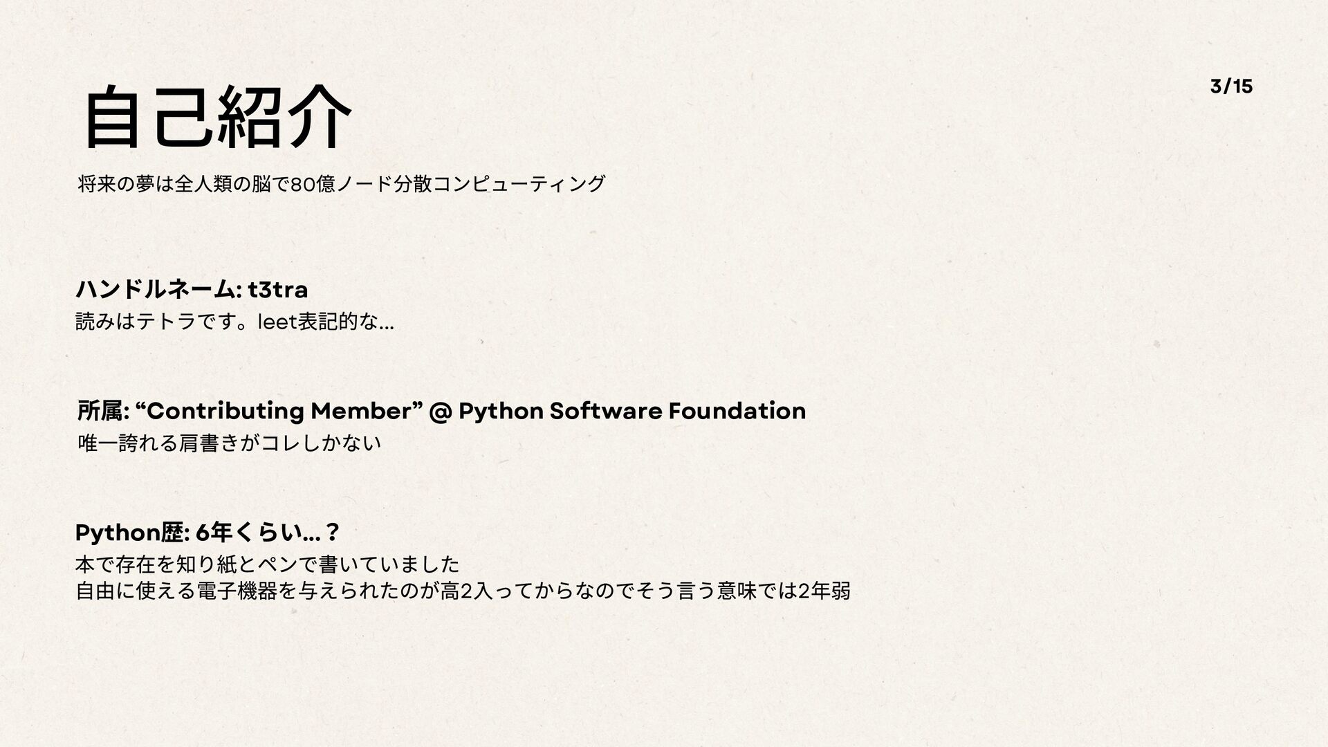 @ Python Software Foundation 唯一誇れる肩書きがコレしかない Python 歴: 6 年くらい... ? 本で存在を知り紙とペンで書いていました 自由に使える電子機器を与えられたのが高2 入ってからなのでそう言う意味では2 年弱 3/15