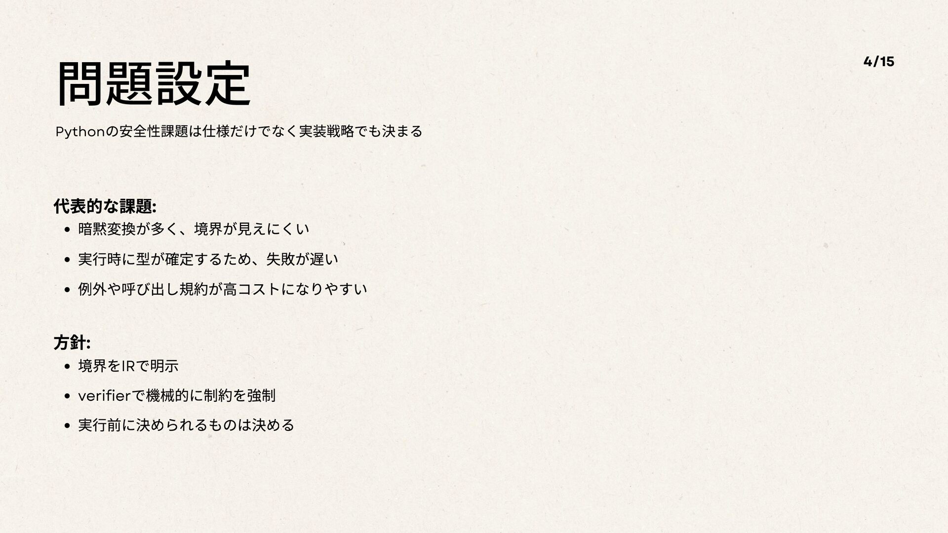 問題設定 Python の安全性課題は仕様だけでなく実装戦略でも決まる 代表的な課題: 暗黙変換が多く、境界が見えにくい 実行時に型が確定するため、失敗が遅い 例外や呼び出し規約が高コストになりやすい 4/15 方針: 境界をIR