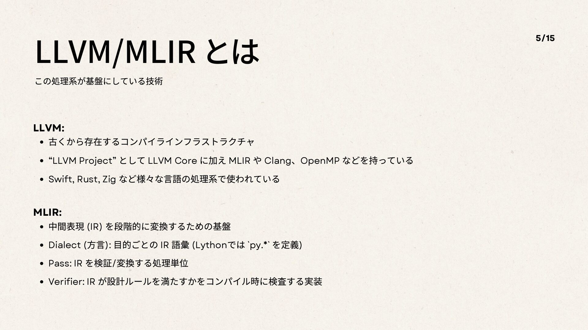 に加え MLIR や Clang 、OpenMP などを持っている Swift, Rust, Zig など様々な言語の処理系で使われている 5/15 MLIR: 中間表現 (IR) を段階的に変換するための基盤 Dialect ( 方言): ⽬的ごとの IR 語彙 (Lython では `py.*` を定義) Pass: IR を検証/ 変換する処理単位 Verifier: IR が設計ルールを満たすかをコンパイル時に検査する実装