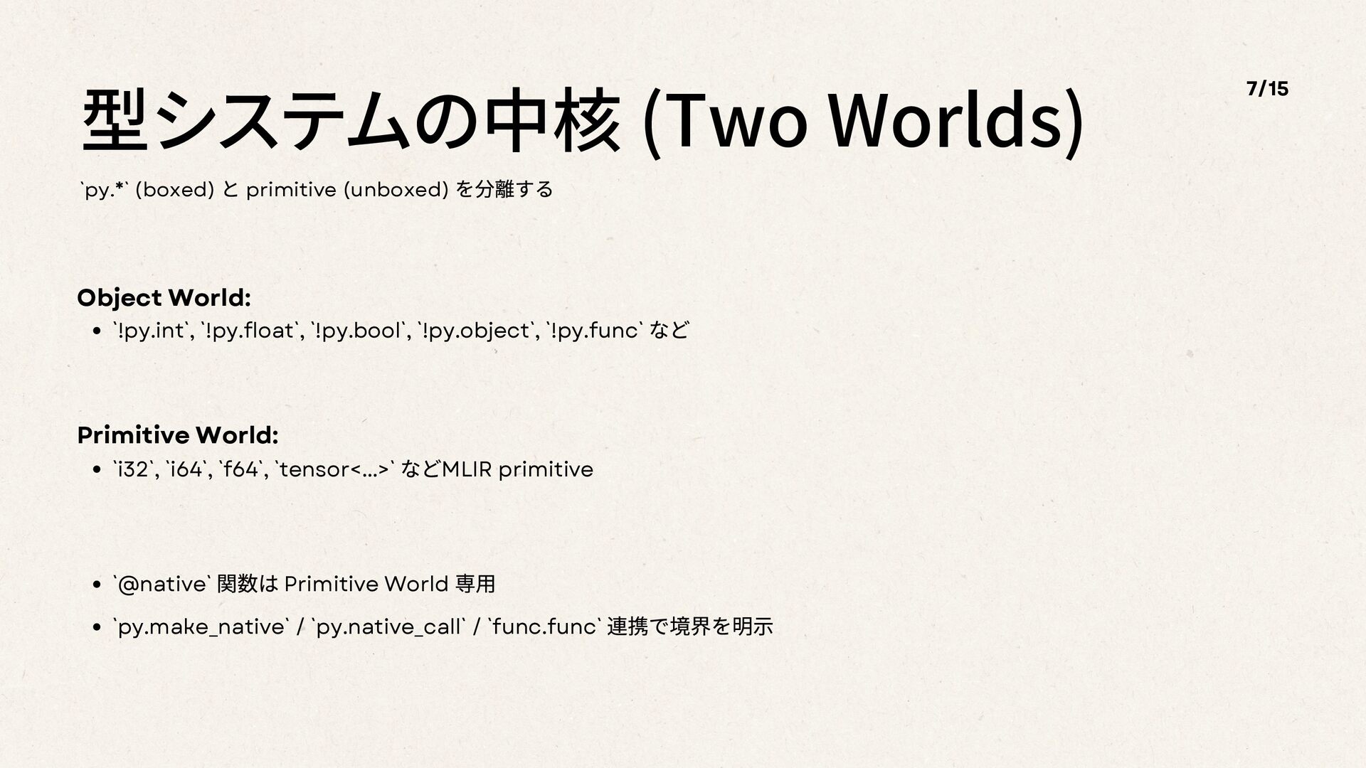 Object World: `!py.int`, `!py.float`, `!py.bool`, `!py.object`, `!py.func` など Primitive World: `i32`, `i64`, `f64`, `tensor<...>` などMLIR primitive `@native` 関数は Primitive World 専⽤ `py.make_native` / `py.native_call` / `func.func` 連携で境界を明⽰