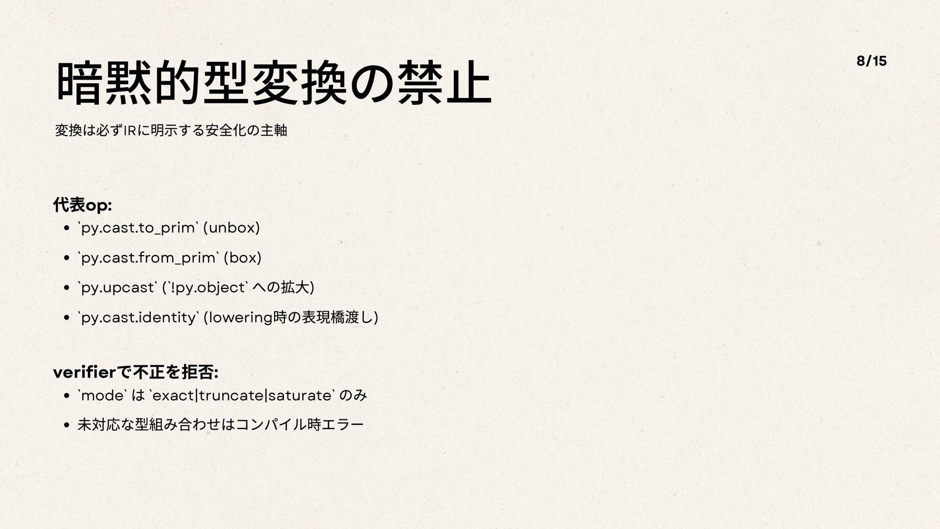 (`!py.object` への拡⼤) `py.cast.identity` (lowering 時の表現橋渡し) verifier で不正を拒否: `mode` は `exact|truncate|saturate` のみ 未対応な型組み合わせはコンパイル時エラー