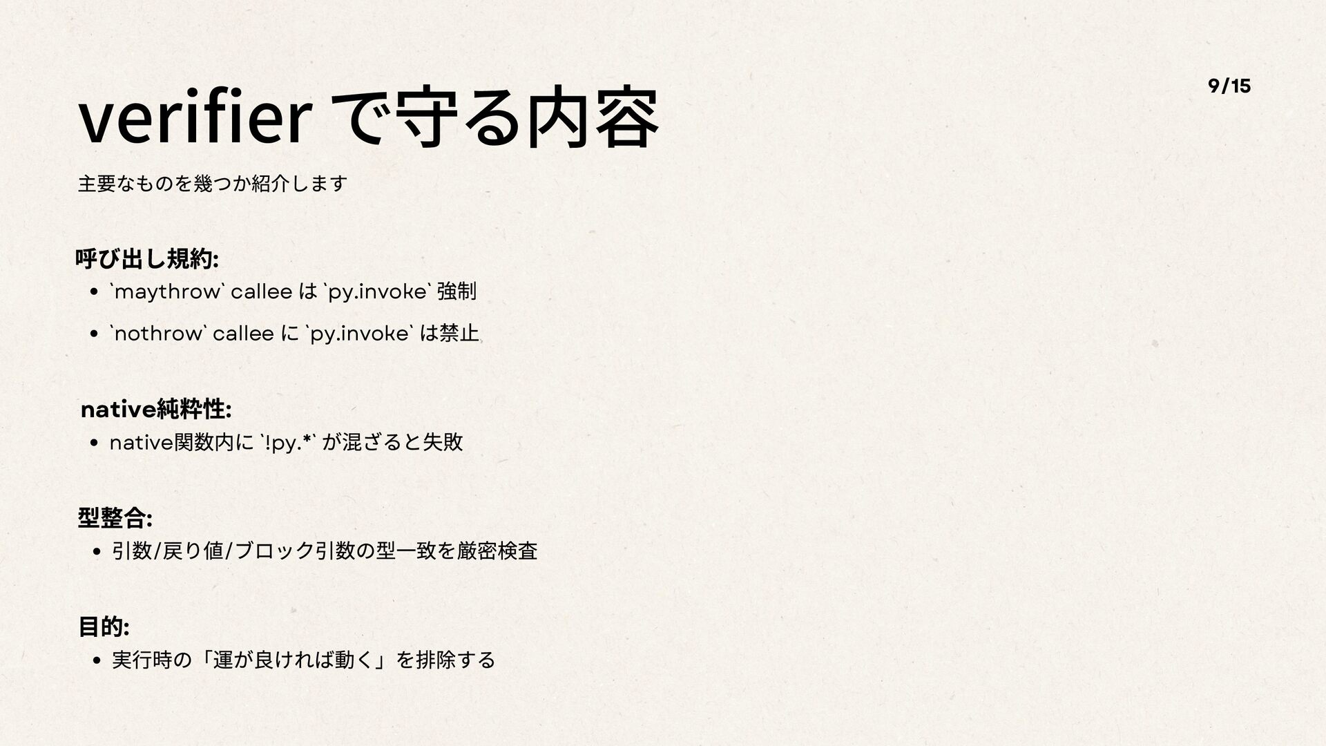 verifier で守る内容 主要なものを幾つか紹介します 9/15 呼び出し規約: `maythrow` callee は `py.invoke` 強制
