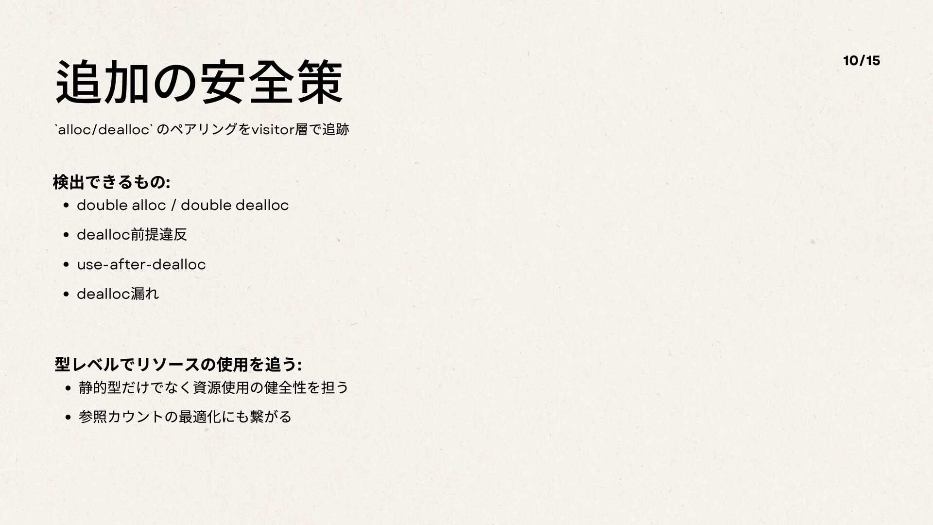 追加の安全策 `alloc/dealloc` のペアリングをvisitor 層で追跡 10/15 検出できるもの: double alloc / double