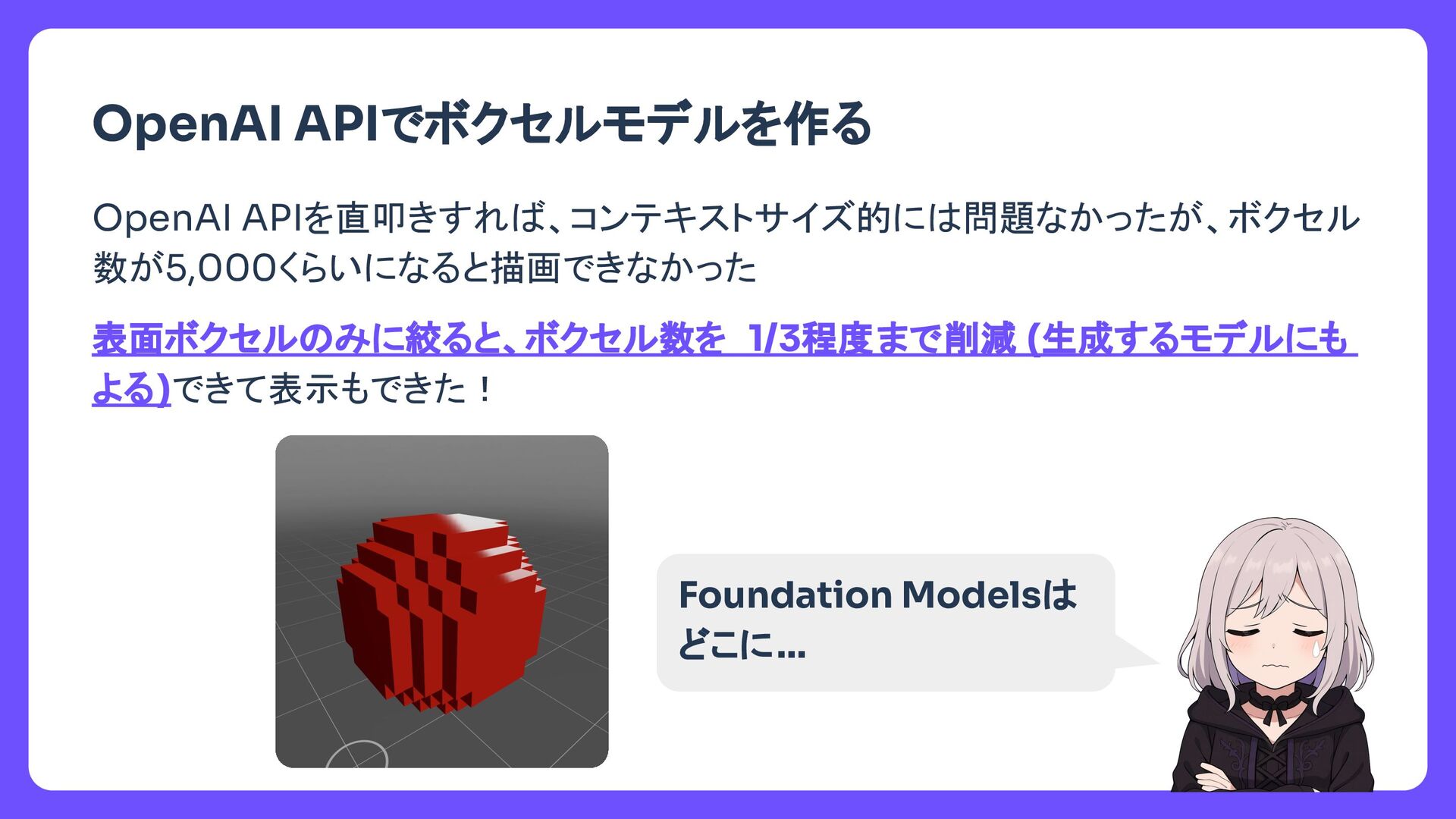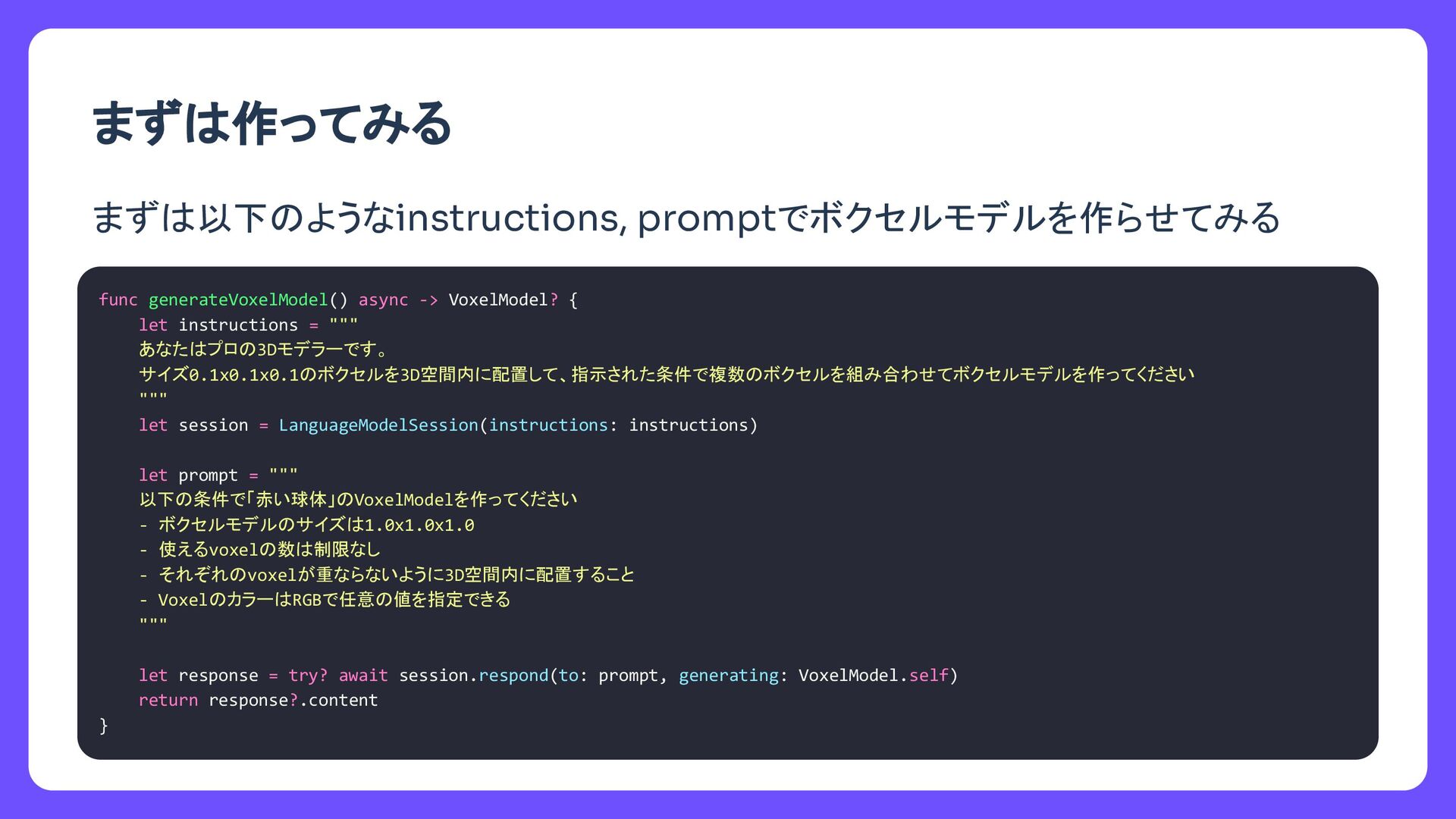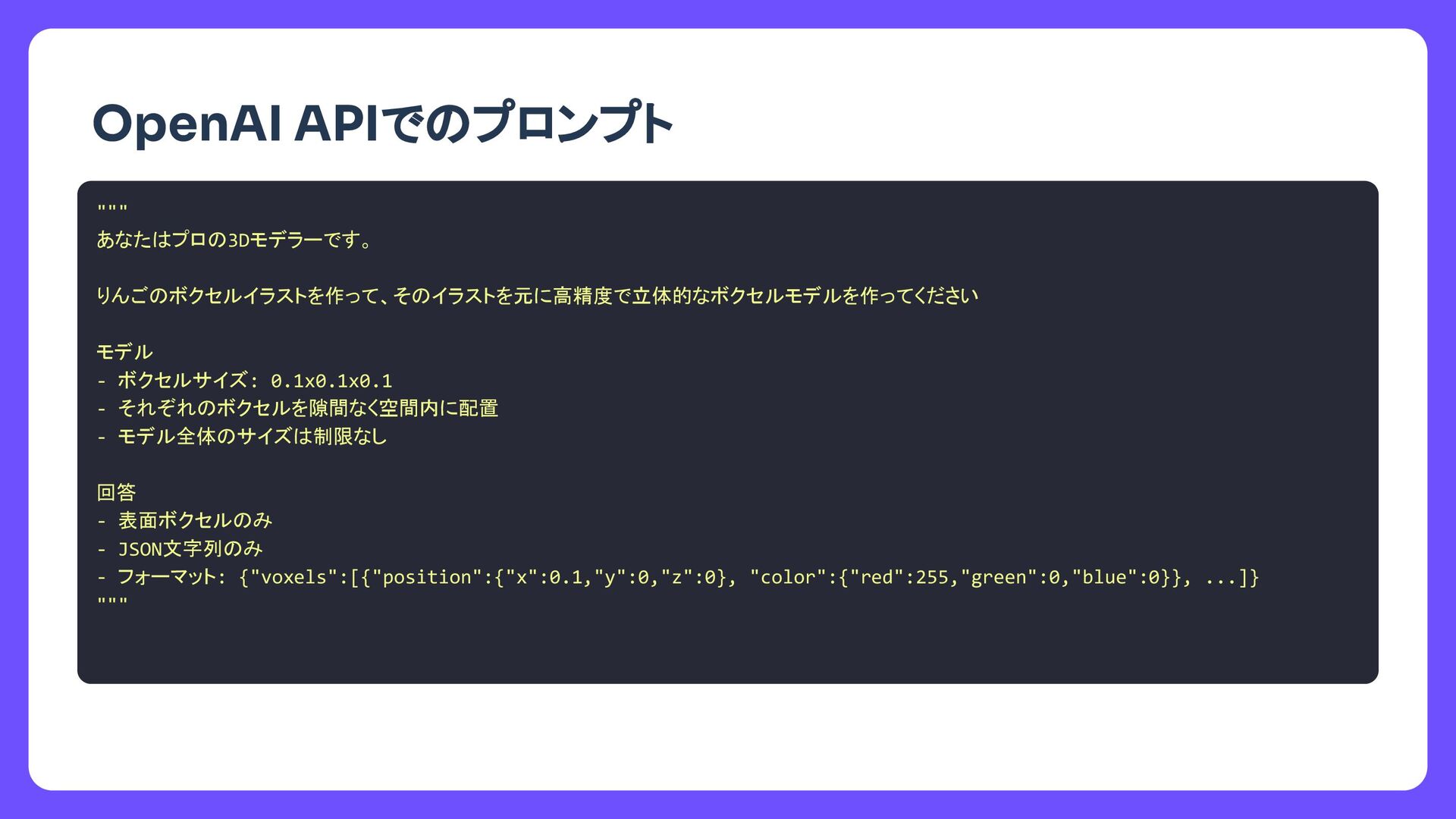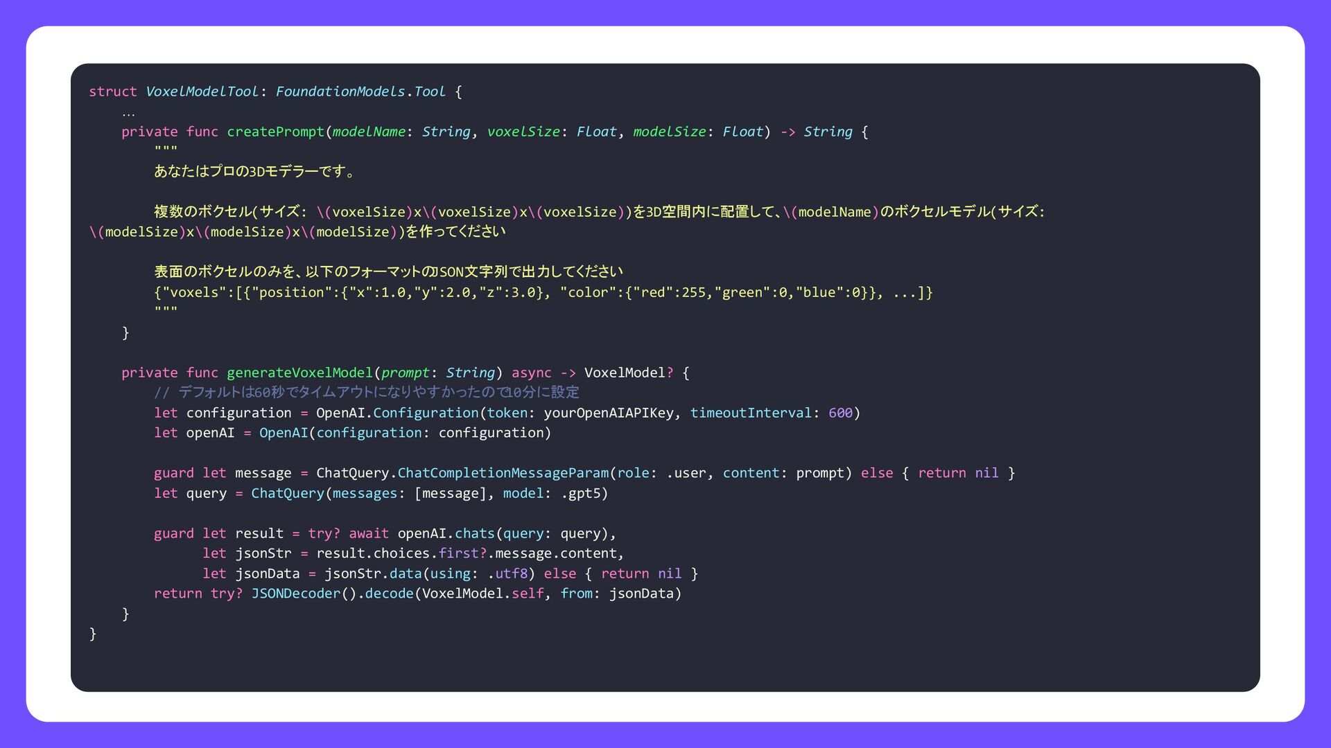 voxelSize: Float, modelSize: Float) -> String { """ あなた プロ 3Dモデラーです。 複数 ボクセル(サイズ: \(voxelSize)x\(voxelSize)x\(voxelSize))を3D空間内に配置して、\(modelName) ボクセルモデル(サイズ: \(modelSize)x\(modelSize)x\(modelSize))を作ってください 表面 ボクセル みを、以下 フォーマット JSON文字列で出力してください {"voxels":[{"position":{"x":1.0,"y":2.0,"z":3.0}, "color":{"red":255,"green":0,"blue":0}}, ...]} """ } private func generateVoxelModel(prompt: String) async -> VoxelModel? { // デフォルト 60秒でタイムアウトになりやすかった で 10分に設定 let configuration = OpenAI.Configuration(token: yourOpenAIAPIKey, timeoutInterval: 600) let openAI = OpenAI(configuration: configuration) guard let message = ChatQuery.ChatCompletionMessageParam(role: .user, content: prompt) else { return nil } let query = ChatQuery(messages: [message], model: .gpt5) guard let result = try? await openAI.chats(query: query), let jsonStr = result.choices.first?.message.content, let jsonData = jsonStr.data(using: .utf8) else { return nil } return try? JSONDecoder().decode(VoxelModel.self, from: jsonData) } }