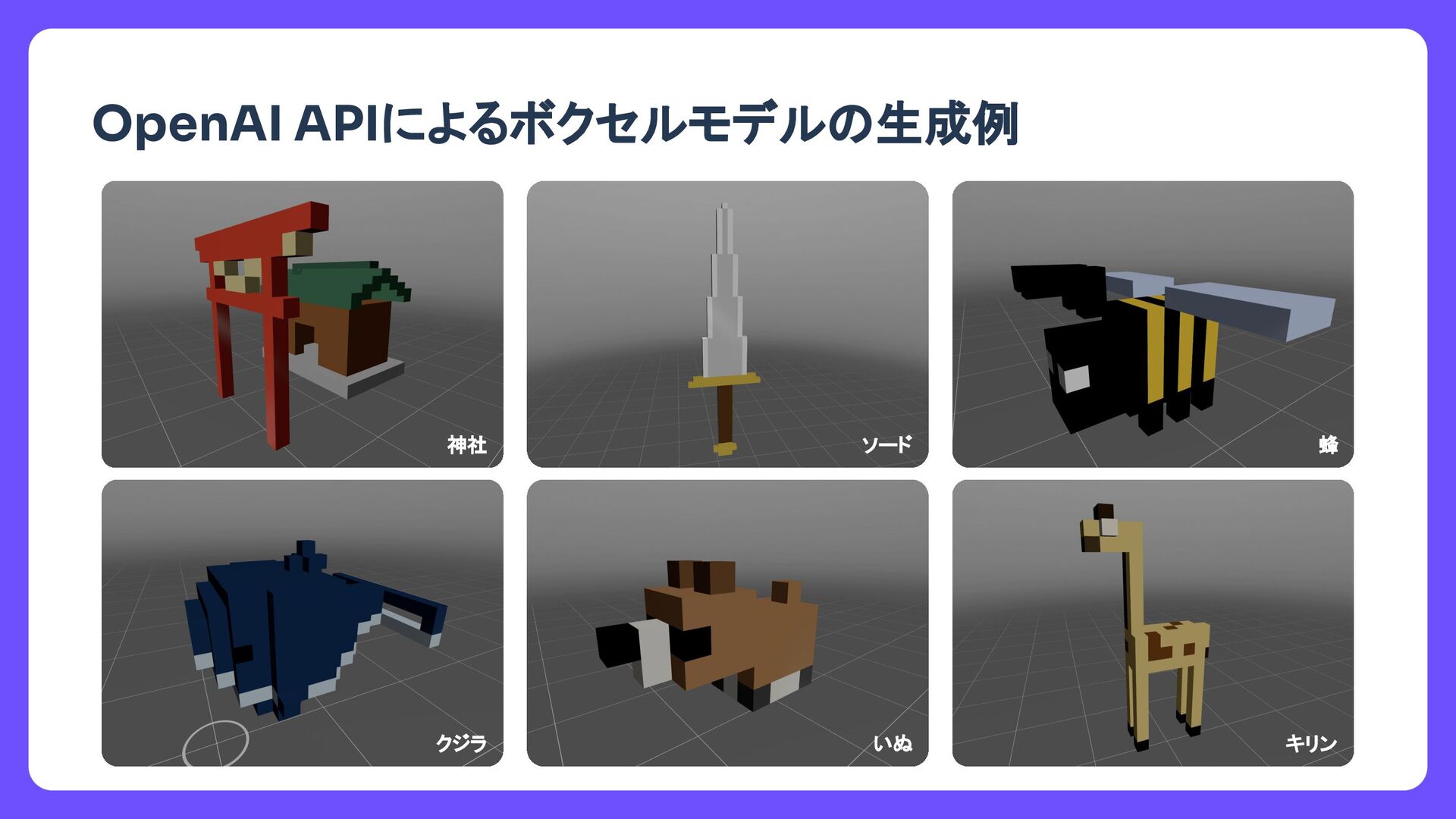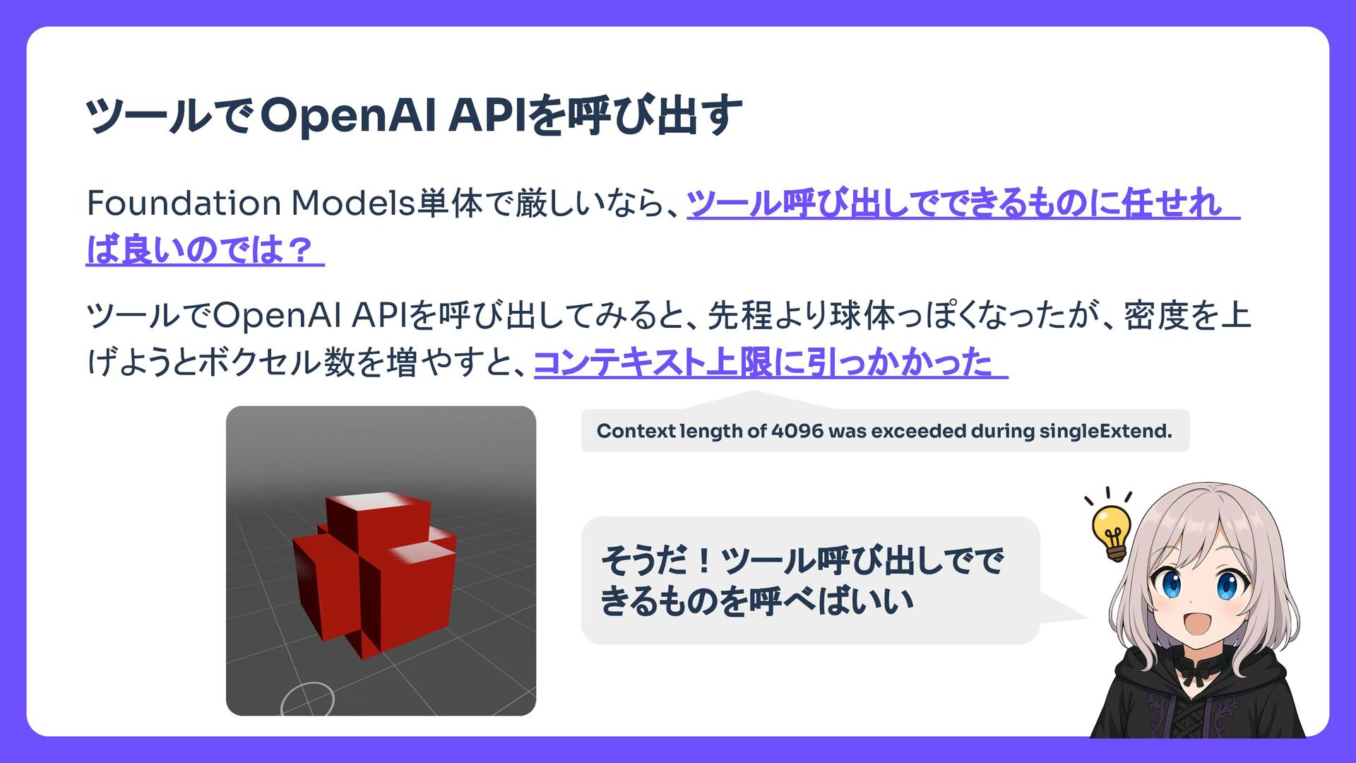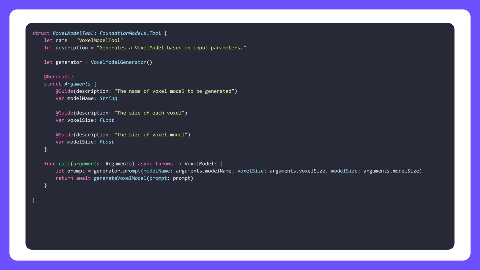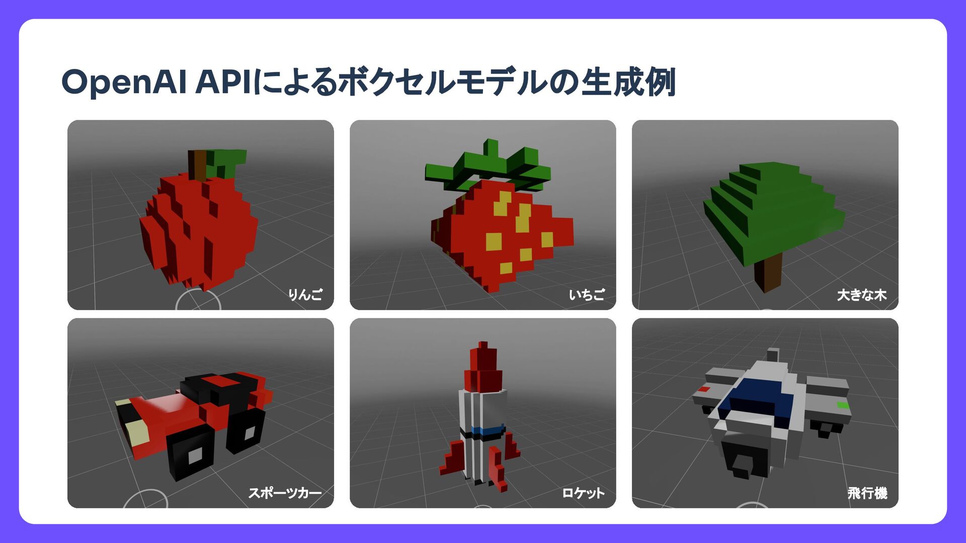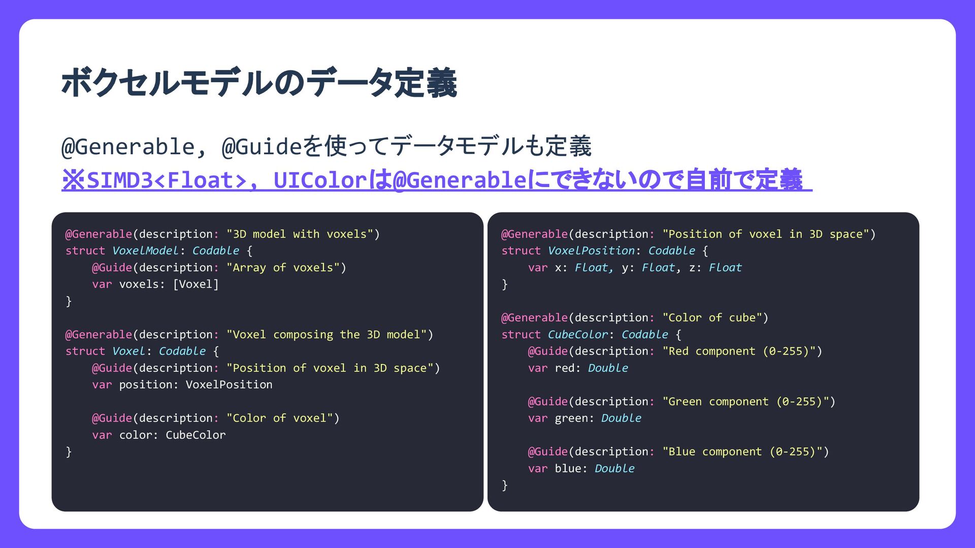 voxelSize: Float, modelSize: Float) -> String { """ あなた プロ 3Dモデラーです。 複数 ボクセル(サイズ: \(voxelSize)x\(voxelSize)x\(voxelSize))を3D空間内に配置して、\(modelName) ボクセルモデル(サイズ: \(modelSize)x\(modelSize)x\(modelSize))を作ってください 表面 ボクセル みを、以下 フォーマット JSON文字列で出力してください {"voxels":[{"position":{"x":1.0,"y":2.0,"z":3.0}, "color":{"red":255,"green":0,"blue":0}}, ...]} """ } private func generateVoxelModel(prompt: String) async -> VoxelModel? { // デフォルト 60秒でタイムアウトになりやすかった で 10分に設定 let configuration = OpenAI.Configuration(token: yourOpenAIAPIKey, timeoutInterval: 600) let openAI = OpenAI(configuration: configuration) guard let message = ChatQuery.ChatCompletionMessageParam(role: .user, content: prompt) else { return nil } let query = ChatQuery(messages: [message], model: .gpt5) guard let result = try? await openAI.chats(query: query), let jsonStr = result.choices.first?.message.content, let jsonData = jsonStr.data(using: .utf8) else { return nil } return try? JSONDecoder().decode(VoxelModel.self, from: jsonData) } }
