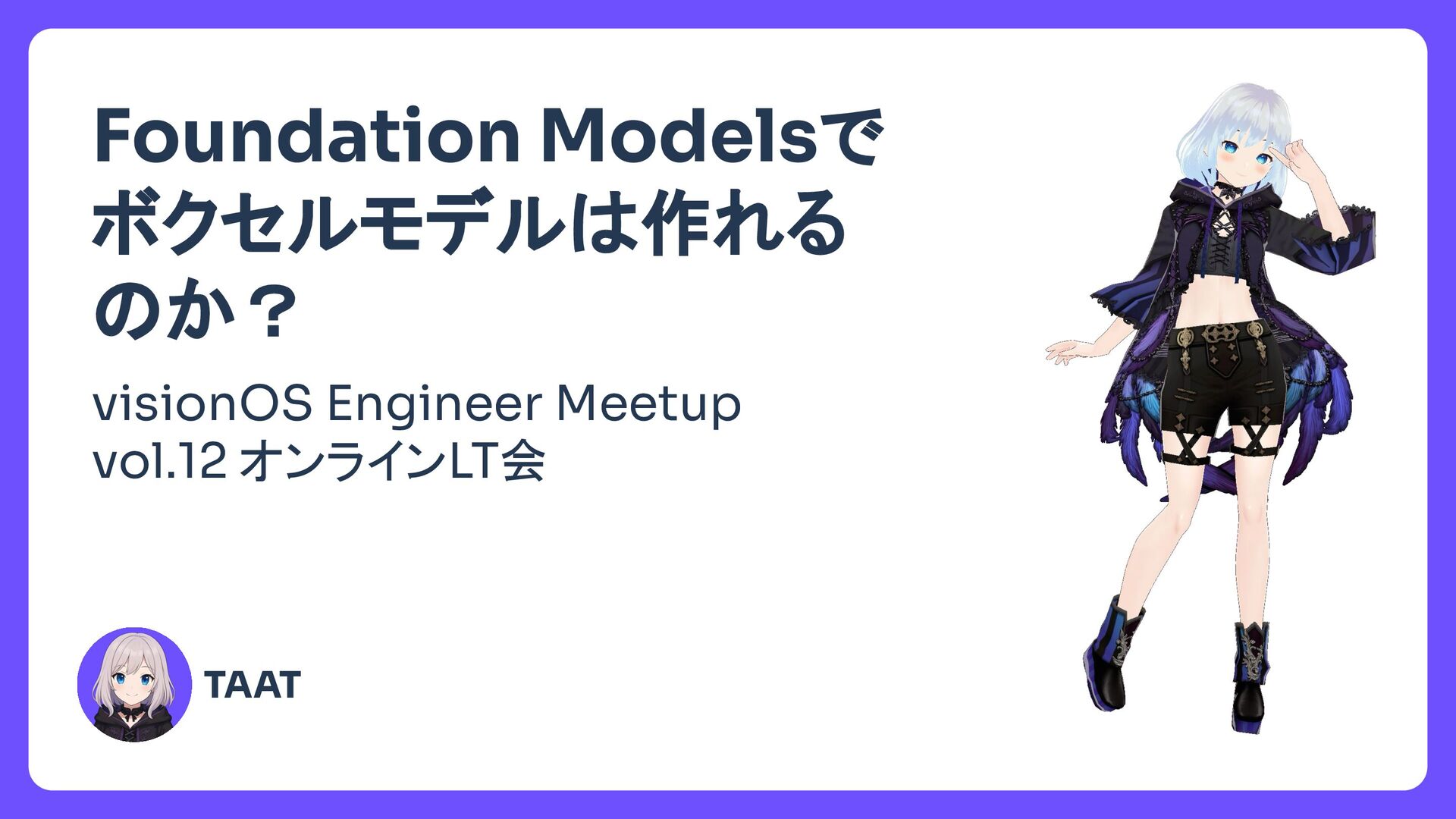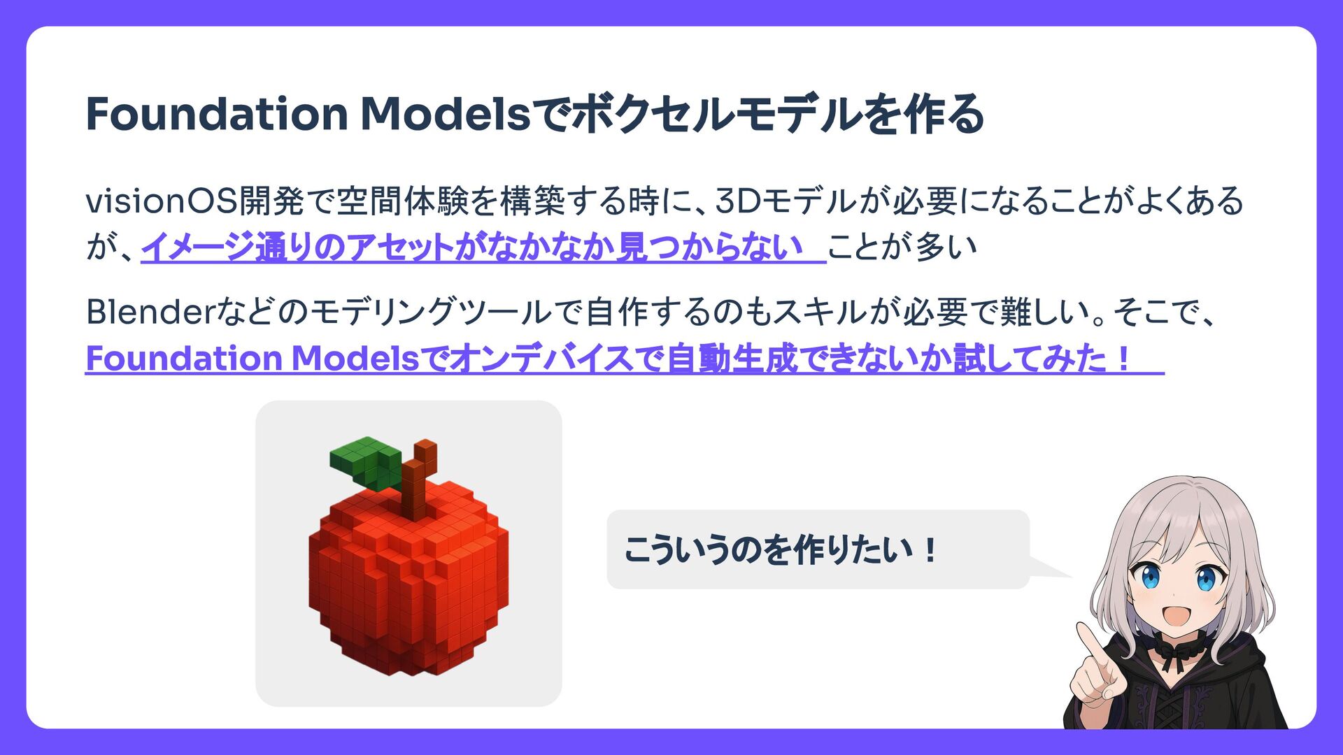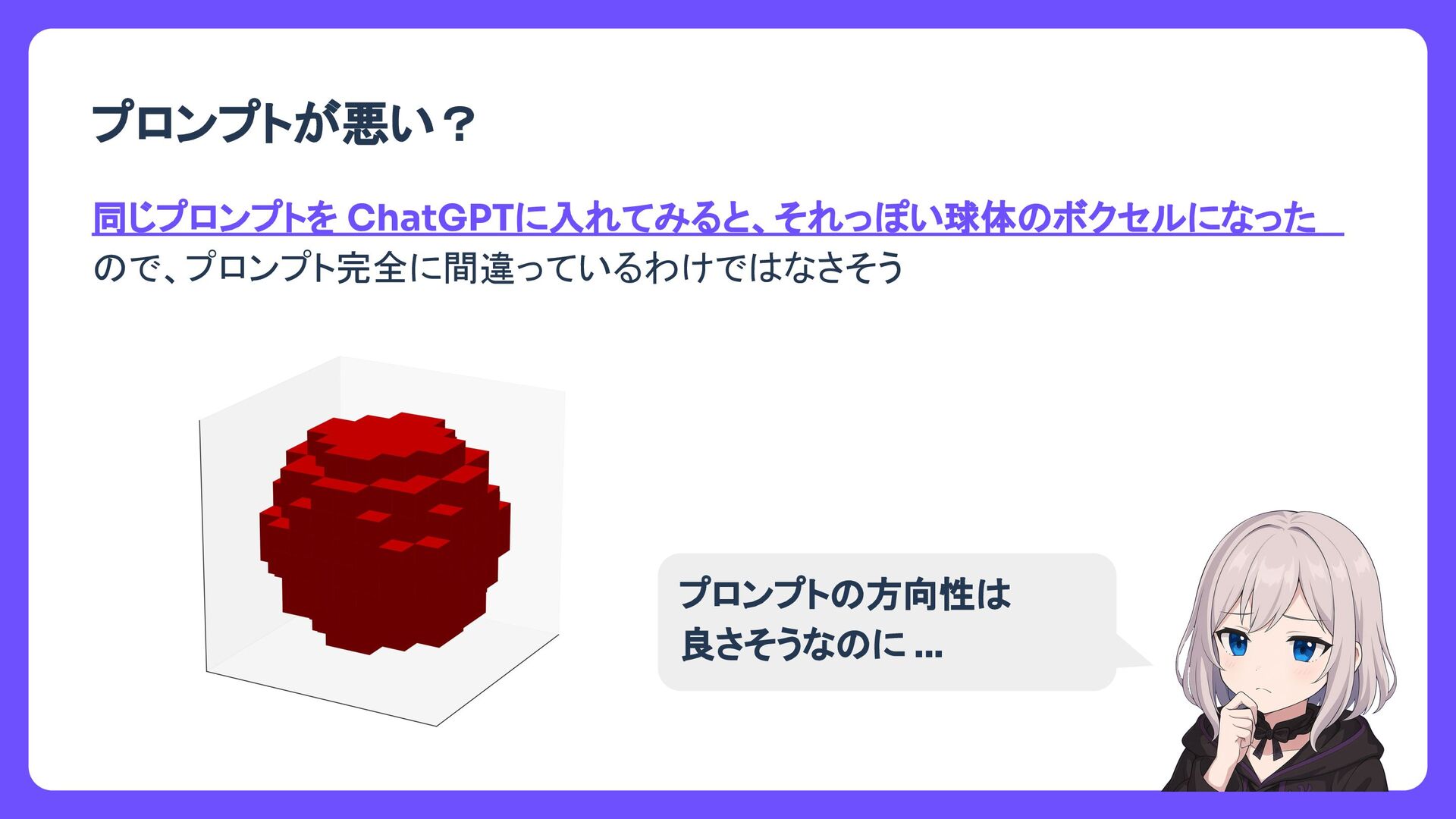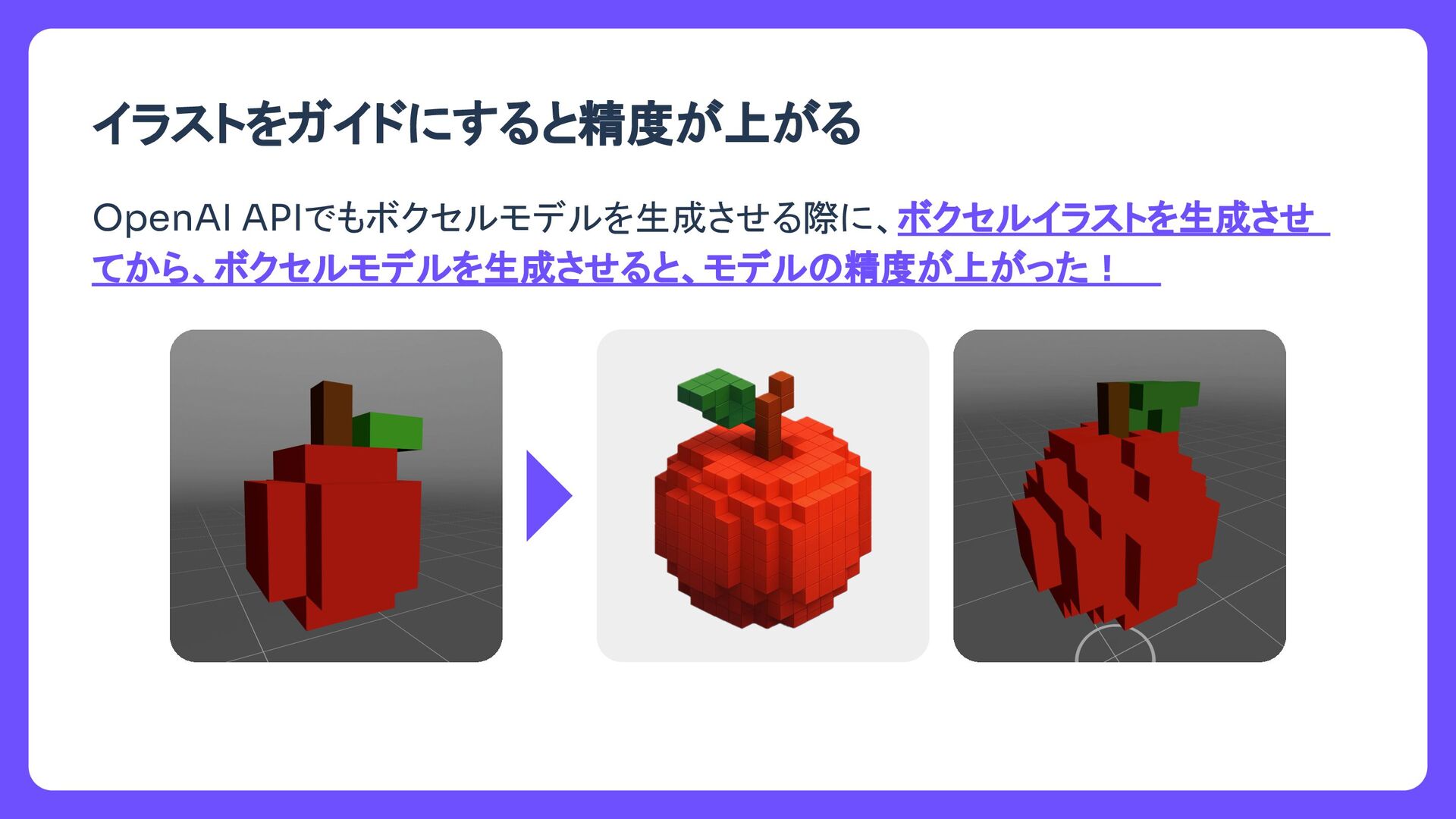voxelSize: Float, modelSize: Float) -> String { """ あなた プロ 3Dモデラーです。 複数 ボクセル(サイズ: \(voxelSize)x\(voxelSize)x\(voxelSize))を3D空間内に配置して、\(modelName) ボクセルモデル(サイズ: \(modelSize)x\(modelSize)x\(modelSize))を作ってください 表面 ボクセル みを、以下 フォーマット JSON文字列で出力してください {"voxels":[{"position":{"x":1.0,"y":2.0,"z":3.0}, "color":{"red":255,"green":0,"blue":0}}, ...]} """ } private func generateVoxelModel(prompt: String) async -> VoxelModel? { // デフォルト 60秒でタイムアウトになりやすかった で 10分に設定 let configuration = OpenAI.Configuration(token: yourOpenAIAPIKey, timeoutInterval: 600) let openAI = OpenAI(configuration: configuration) guard let message = ChatQuery.ChatCompletionMessageParam(role: .user, content: prompt) else { return nil } let query = ChatQuery(messages: [message], model: .gpt5) guard let result = try? await openAI.chats(query: query), let jsonStr = result.choices.first?.message.content, let jsonData = jsonStr.data(using: .utf8) else { return nil } return try? JSONDecoder().decode(VoxelModel.self, from: jsonData) } }