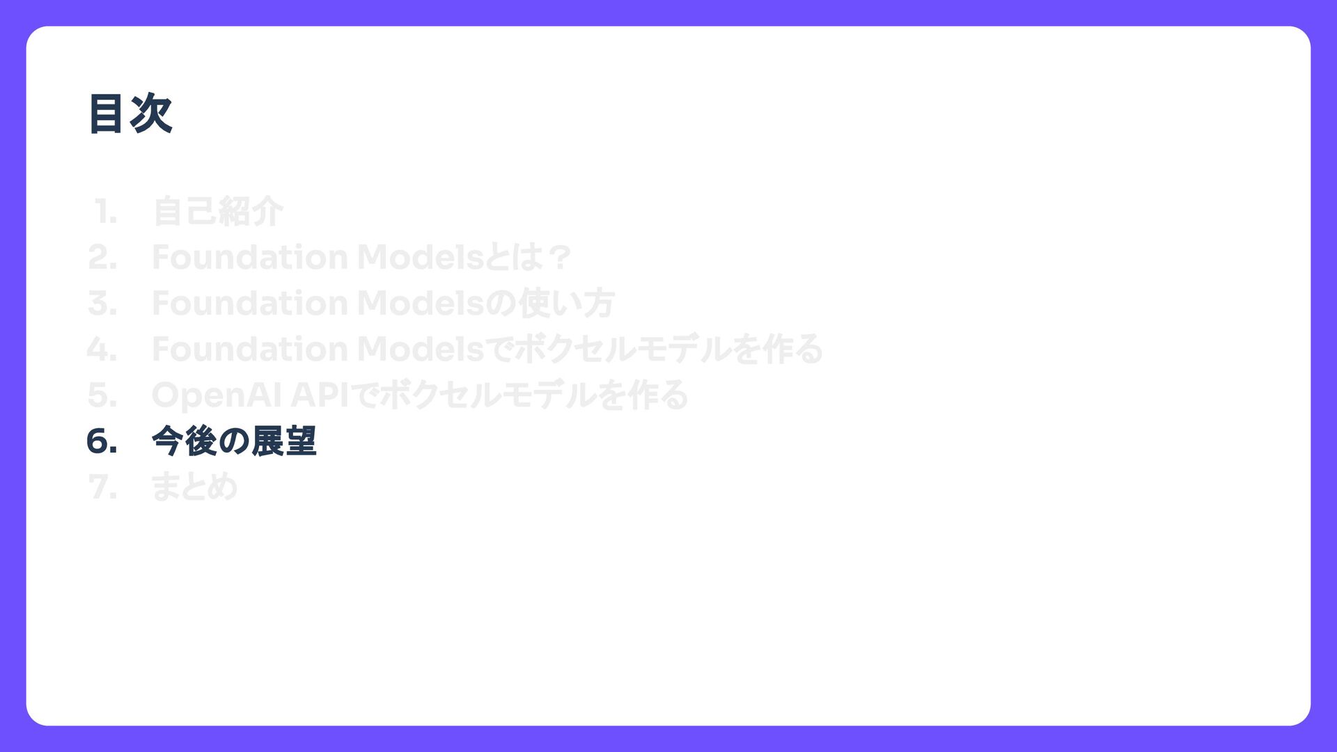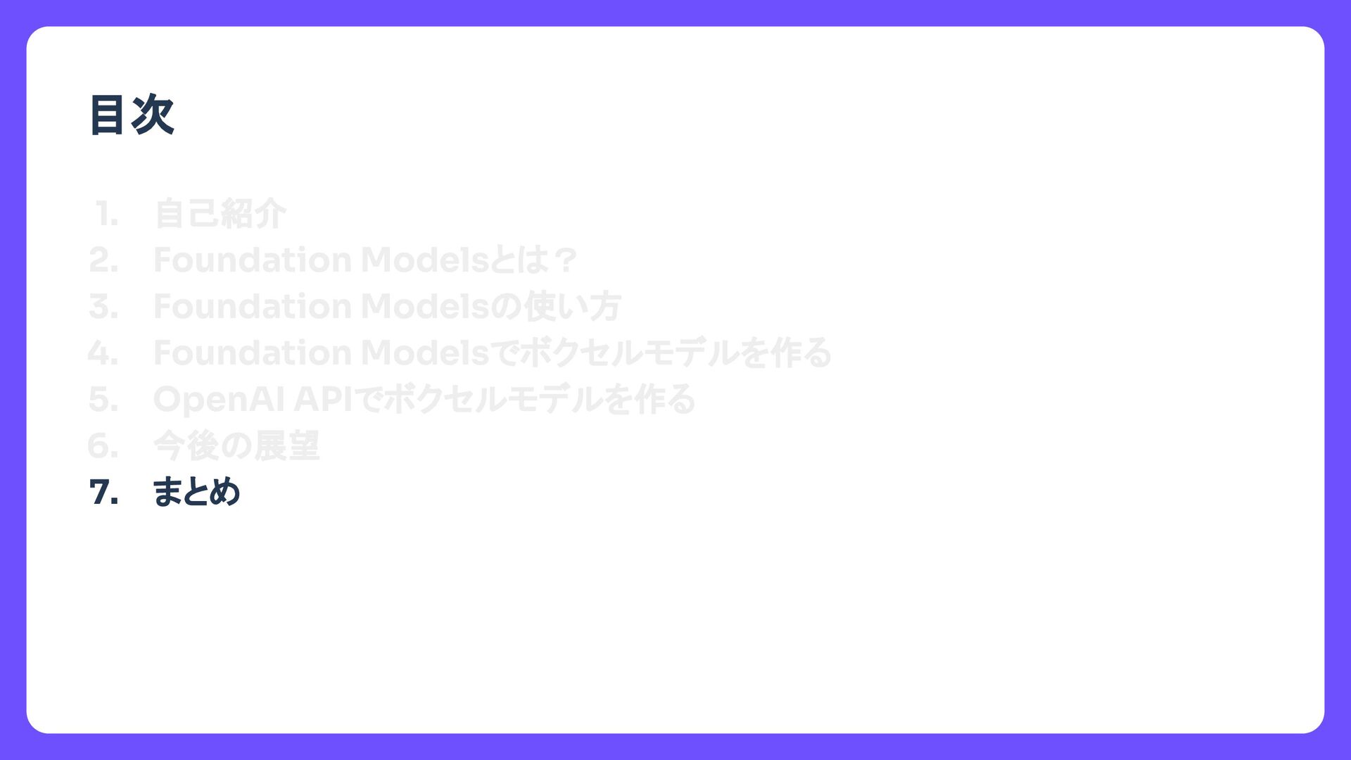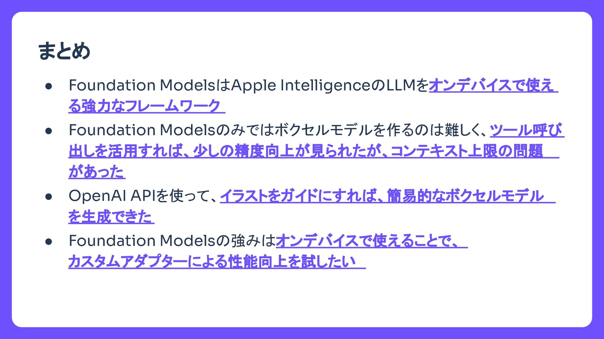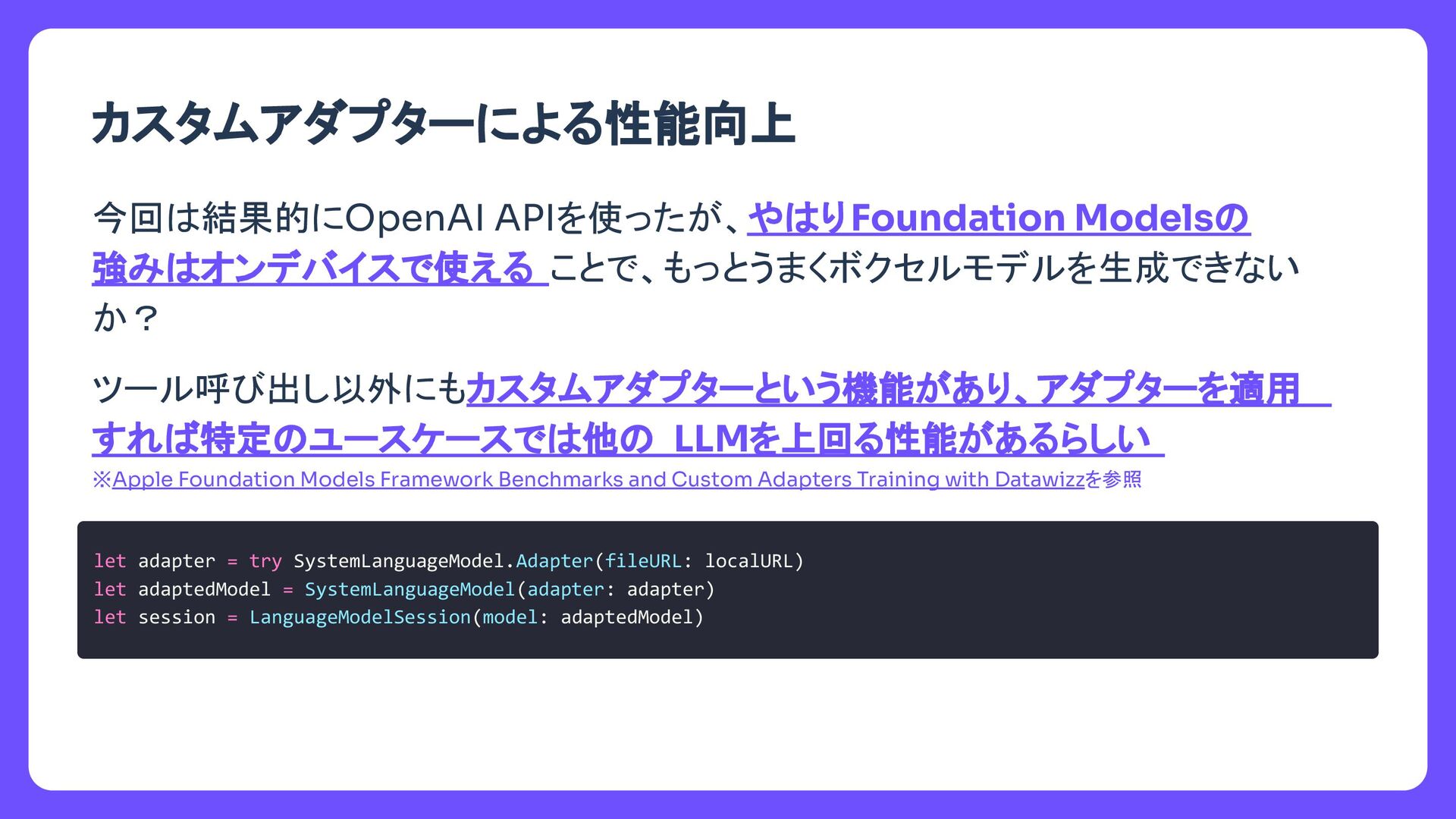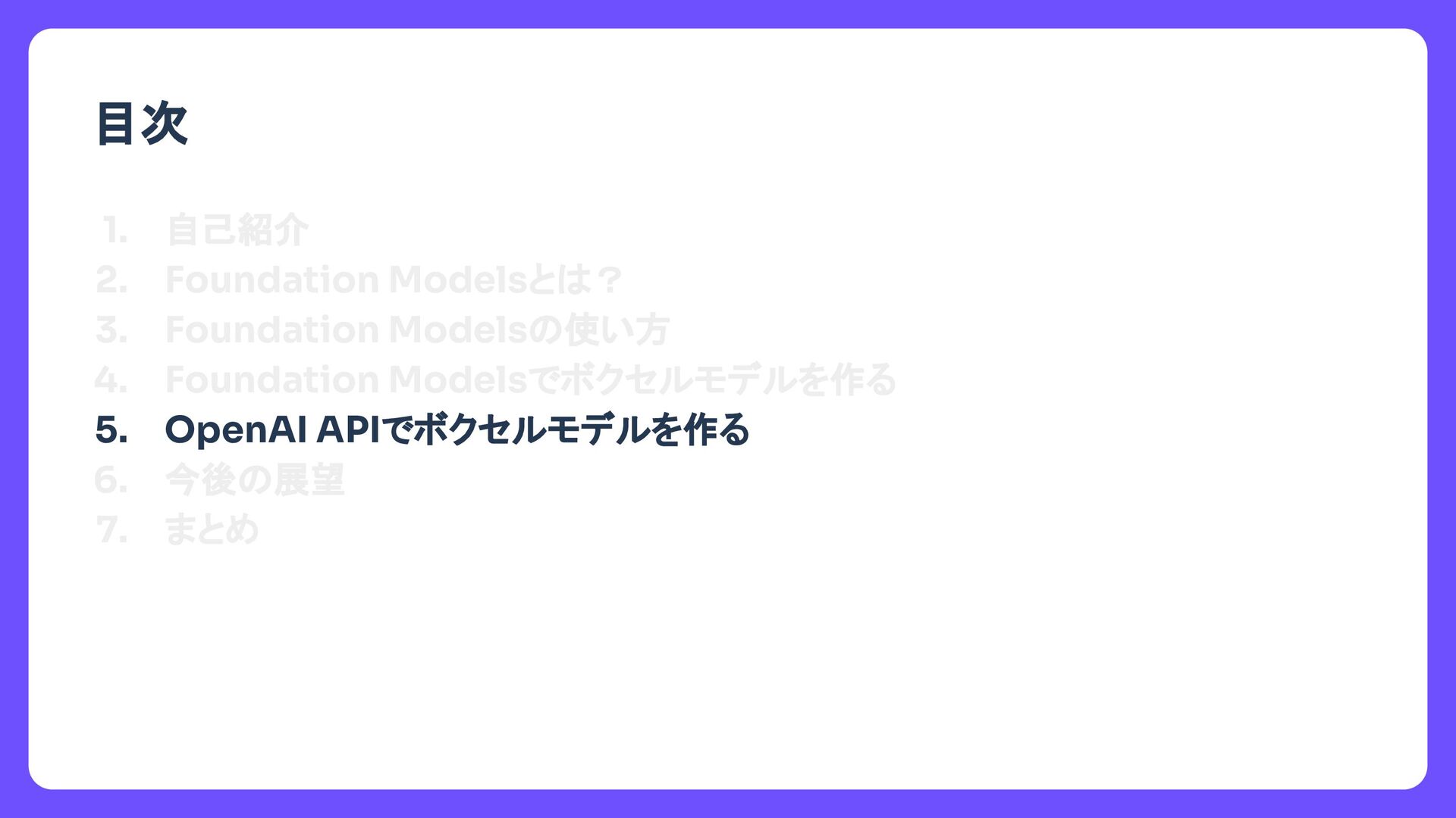 voxelSize: Float, modelSize: Float) -> String { """ あなた プロ 3Dモデラーです。 複数 ボクセル(サイズ: \(voxelSize)x\(voxelSize)x\(voxelSize))を3D空間内に配置して、\(modelName) ボクセルモデル(サイズ: \(modelSize)x\(modelSize)x\(modelSize))を作ってください 表面 ボクセル みを、以下 フォーマット JSON文字列で出力してください {"voxels":[{"position":{"x":1.0,"y":2.0,"z":3.0}, "color":{"red":255,"green":0,"blue":0}}, ...]} """ } private func generateVoxelModel(prompt: String) async -> VoxelModel? { // デフォルト 60秒でタイムアウトになりやすかった で 10分に設定 let configuration = OpenAI.Configuration(token: yourOpenAIAPIKey, timeoutInterval: 600) let openAI = OpenAI(configuration: configuration) guard let message = ChatQuery.ChatCompletionMessageParam(role: .user, content: prompt) else { return nil } let query = ChatQuery(messages: [message], model: .gpt5) guard let result = try? await openAI.chats(query: query), let jsonStr = result.choices.first?.message.content, let jsonData = jsonStr.data(using: .utf8) else { return nil } return try? JSONDecoder().decode(VoxelModel.self, from: jsonData) } }