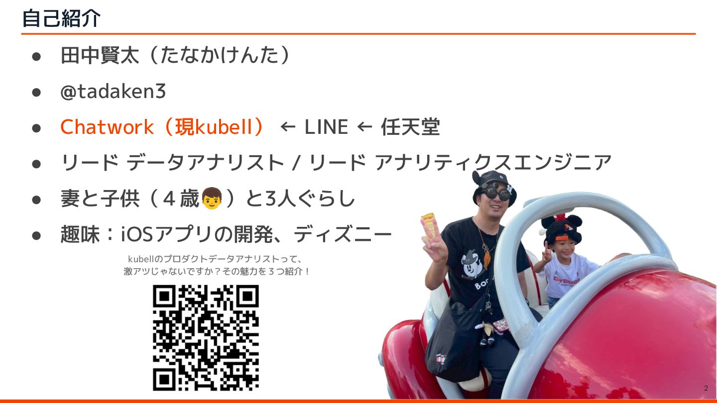 ← 任天堂 • リード データアナリスト / リード アナリティクスエンジニア • 妻と子供(4歳👦)と3人ぐらし • 趣味:iOSアプリの開発、ディズニー kubellのプロダクトデータアナリストって、 激アツじゃないですか?その魅力を3つ紹介!
