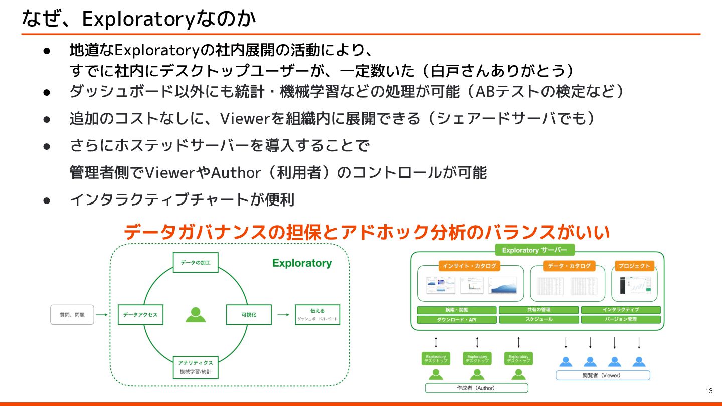 • 地道なExploratoryの社内展開の活動により、 すでに社内にデスクトップユーザーが、一定数いた(白戸さんありがとう) • ダッシュボード以外にも統計・機械学習などの処理が可能(ABテストの検定など) • 追加のコストなしに、Viewerを組織内に展開できる(シェアードサーバでも) • さらにホステッドサーバーを導入することで 管理者側でViewerやAuthor(利用者)のコントロールが可能
