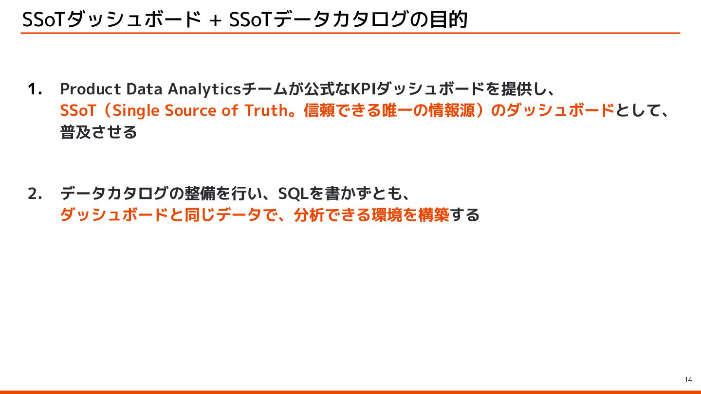14 1. Product Data Analyticsチームが公式なKPIダッシュボードを提供し、 SSoT(Single Source of Truth。信頼できる唯一の情報源)のダッシュボードとして、 普及させる
