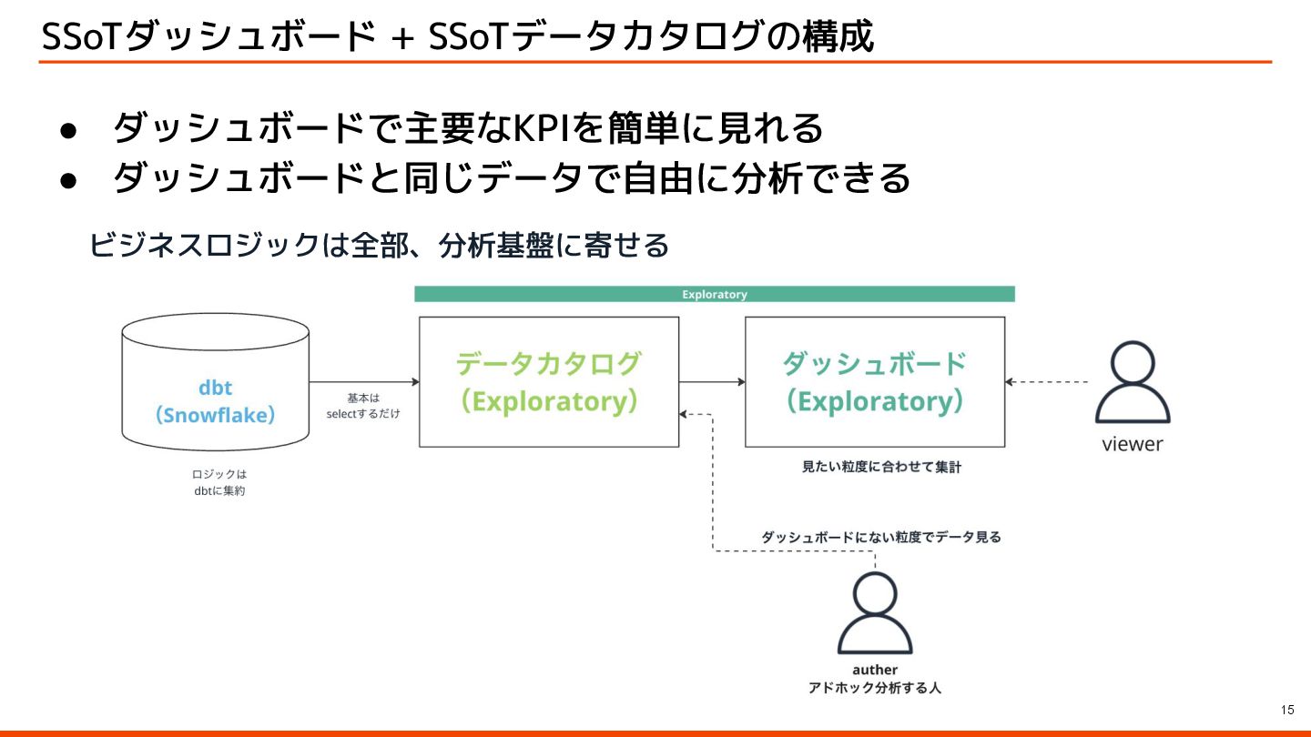 2. データカタログの整備を行い、SQLを書かずとも、 ダッシュボードと同じデータで、分析できる環境を構築する SSoTダッシュボード + SSoTデータカタログの目的