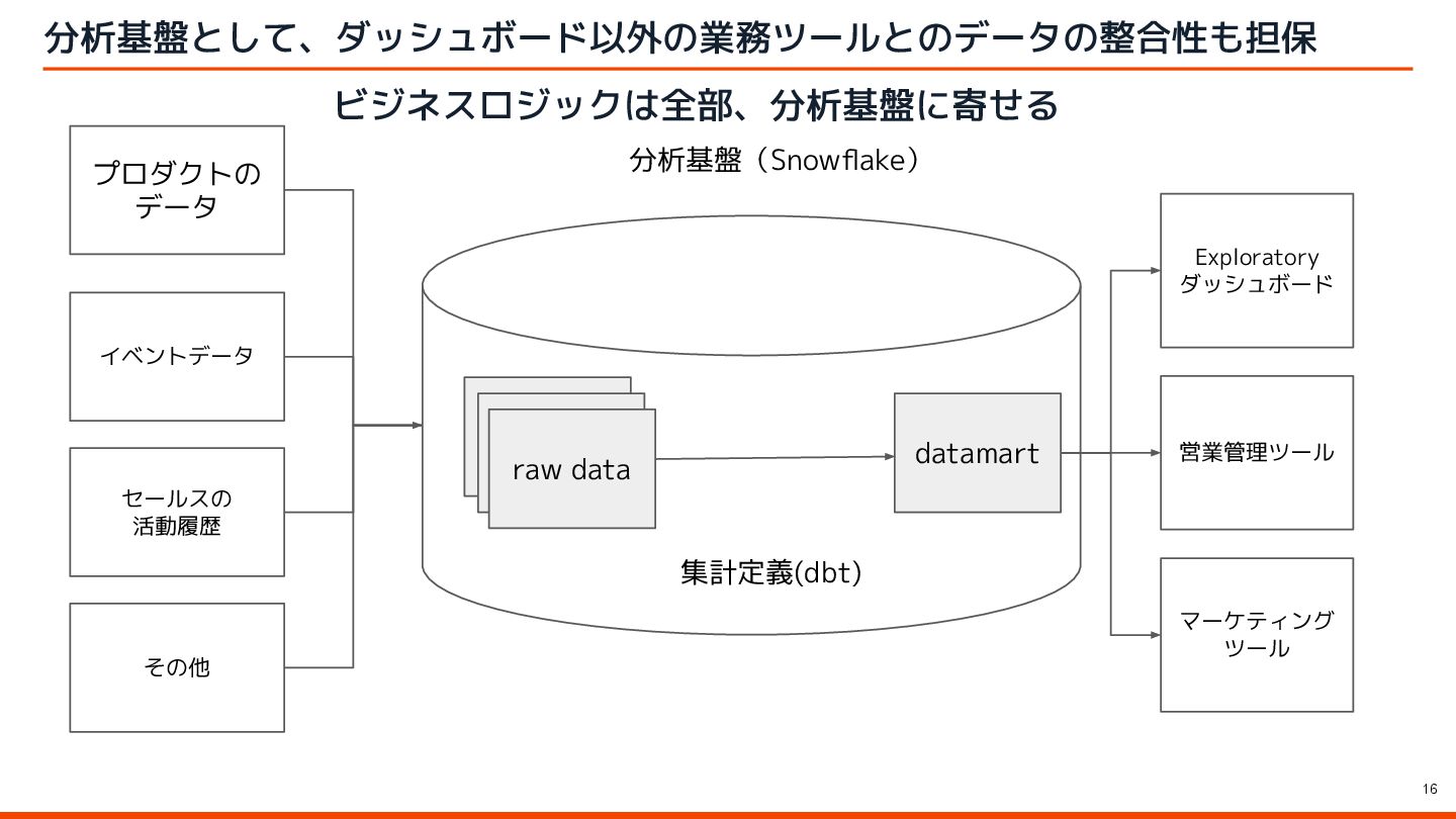 datamart マーケティング ツール Exploratory ダッシュボード 営業管理ツール 分析基盤(Snowflake) 集計定義(dbt) ビジネスロジックは全部、分析基盤に寄せる