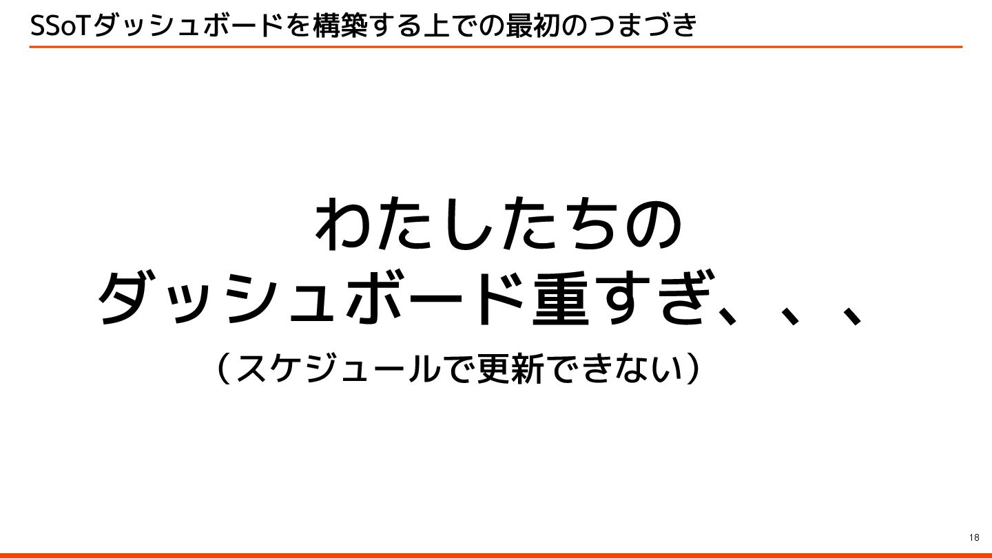 SSoTダッシュボードを構築する上での最初のつまづき 18 わたしたちの ダッシュボード重すぎ、、、 (スケジュールで更新できない)