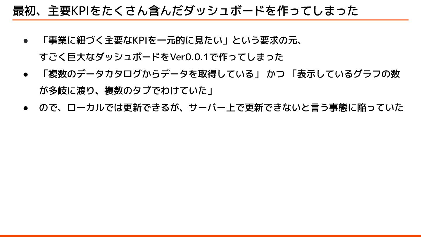 最初、主要KPIをたくさん含んだダッシュボードを作ってしまった • 「事業に紐づく主要なKPIを一元的に見たい」という要求の元、 すごく巨大なダッシュボードをVer0.0.1で作ってしまった • 「複数のデータカタログからデータを取得している」 かつ 「表示しているグラフの数 が多岐に渡り、複数のタブでわけていた」 •
