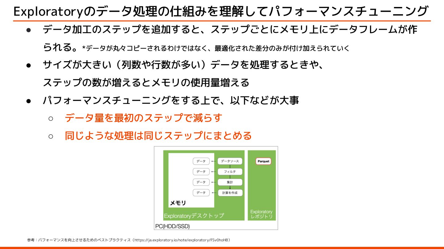 Exploratoryのデータ処理の仕組みを理解してパフォーマンスチューニング • データ加工のステップを追加すると、ステップごとにメモリ上にデータフレームが作 られる。*データが丸々コピーされるわけではなく、最適化された差分のみが付け加えられていく • サイズが大きい(列数や行数が多い)データを処理するときや、 ステップの数が増えるとメモリの使用量増える • パフォーマンスチューニングをする上で、以下などが大事 ◦