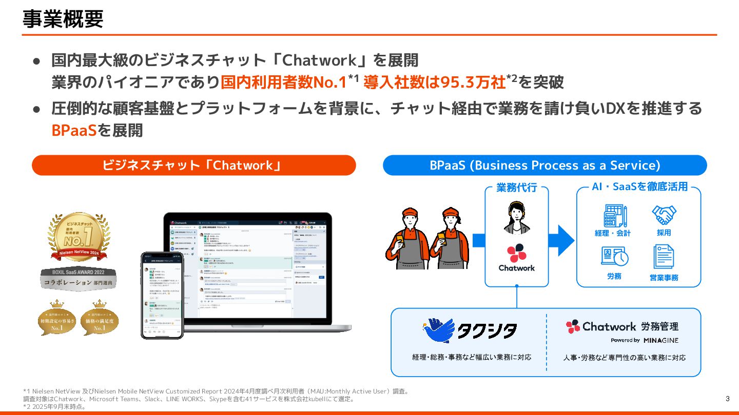Active User)調査。 調査対象はChatwork、Microsoft Teams、Slack、LINE WORKS、Skypeを含む41サービスを株式会社kubellにて選定。 *2 2025年9月末時点。 • 国内最大級のビジネスチャット「Chatwork」を展開 業界のパイオニアであり国内利用者数No.1*1 導入社数は95.3万社*2を突破 • 圧倒的な顧客基盤とプラットフォームを背景に、チャット経由で業務を請け負いDXを推進する BPaaSを展開 BPaaS (Business Process as a Service) ビジネスチャット「Chatwork」 業務代行 経理・総務・事務など幅広い業務に対応 人事・労務など専門性の高い業務に対応 採用 経理・会計 労務 営業事務 AI・SaaSを徹底活用 3