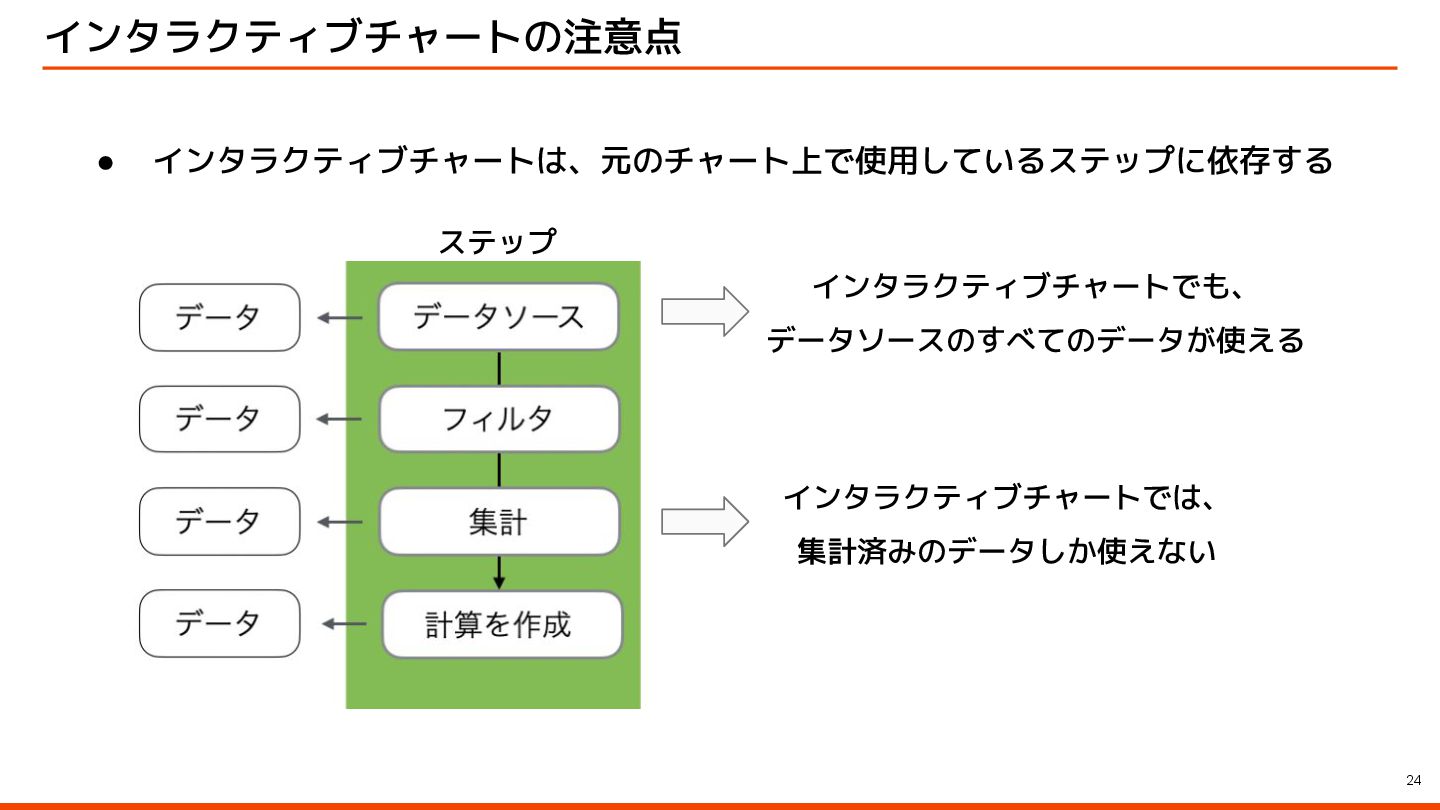 インタラクティブチャートの注意点 24 • インタラクティブチャートは、元のチャート上で使用しているステップに依存する インタラクティブチャートでは、 集計済みのデータしか使えない インタラクティブチャートでも、 データソースのすべてのデータが使える ステップ