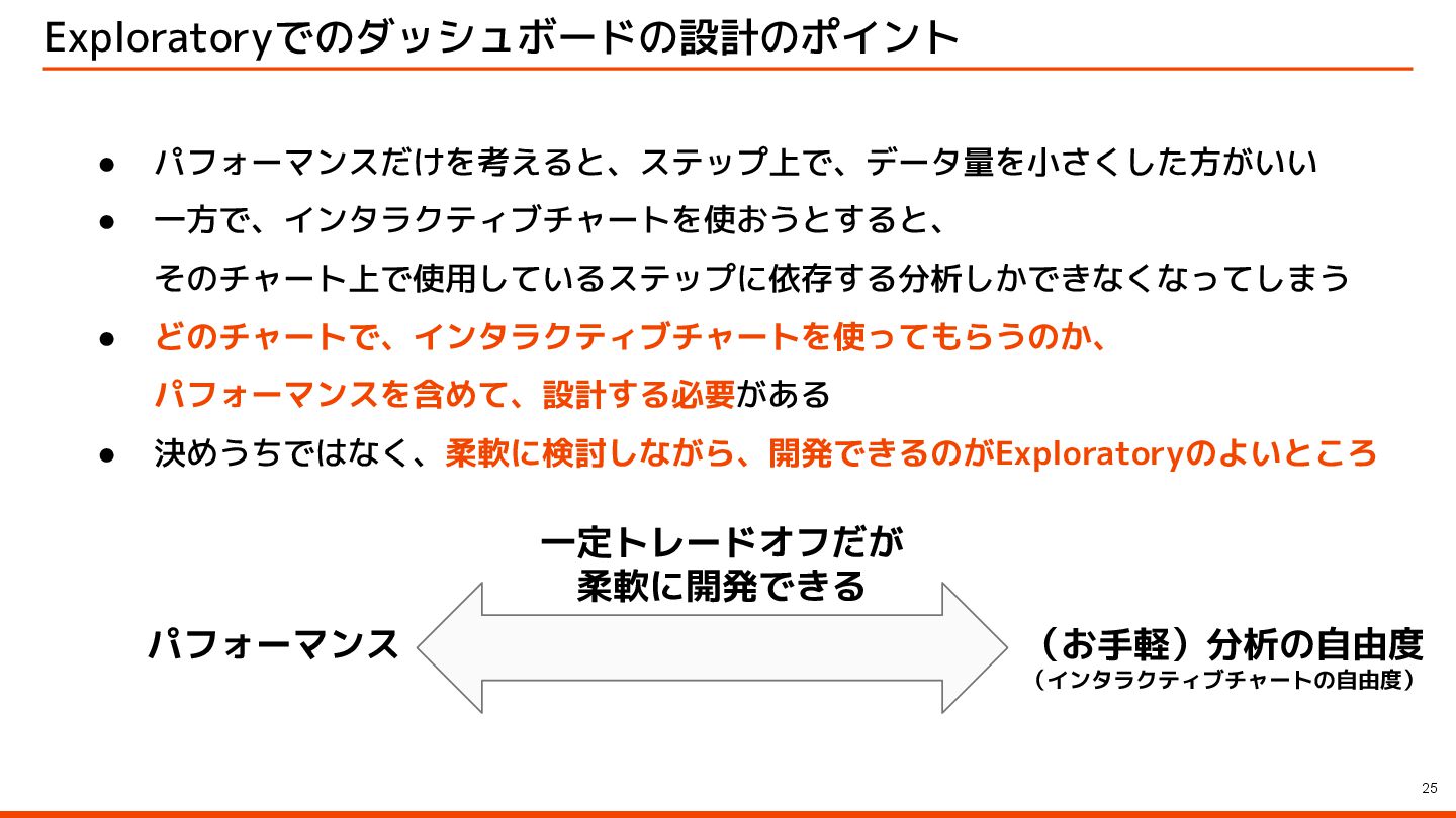 • 決めうちではなく、柔軟に検討しながら、開発できるのがExploratoryのよいところ パフォーマンス (お手軽)分析の自由度 (インタラクティブチャートの自由度) 一定トレードオフだが 柔軟に開発できる