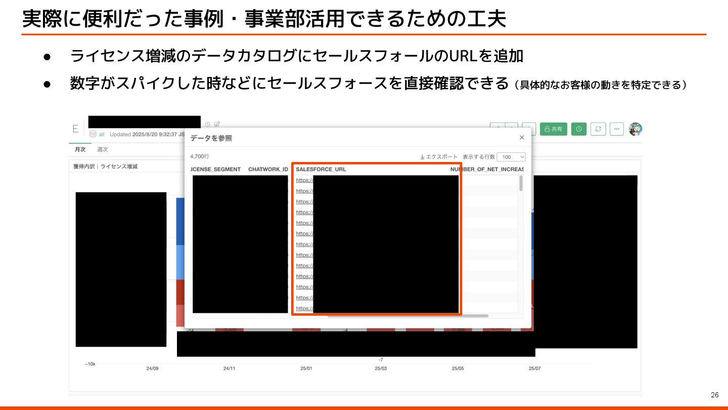 実際に便利だった事例・事業部活用できるための工夫 26 • ライセンス増減のデータカタログにセールスフォールのURLを追加 • 数字がスパイクした時などにセールスフォースを直接確認できる(具体的なお客様の動きを特定できる)