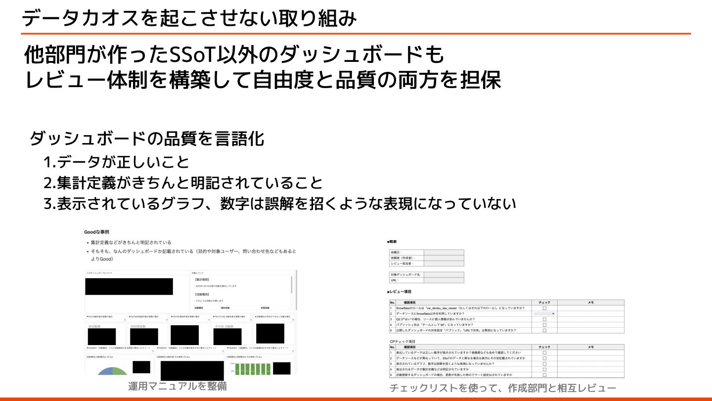 データカオスを起こさせない取り組み ダッシュボードの品質を言語化 他部門が作ったSSoT以外のダッシュボードも レビュー体制を構築して自由度と品質の両方を担保 1.データが正しいこと 2.集計定義がきちんと明記されていること 3.表示されているグラフ、数字は誤解を招くような表現になっていない 運用マニュアルを整備 チェックリストを使って、作成部門と相互レビュー