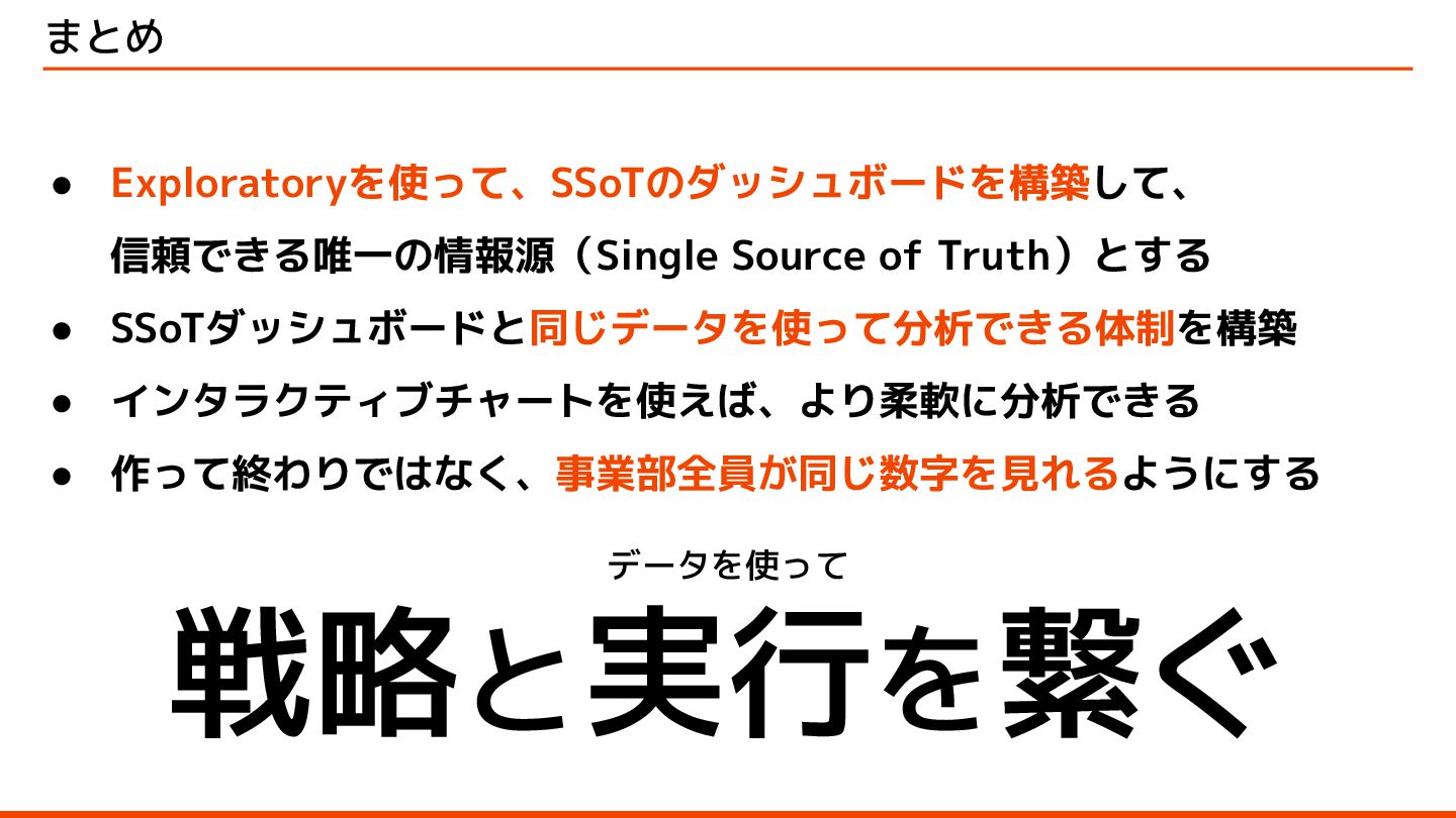 まとめ • Exploratoryを使って、SSoTのダッシュボードを構築して、 信頼できる唯一の情報源(Single Source of Truth)とする • SSoTダッシュボードと同じデータを使って分析できる体制を構築 •